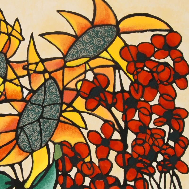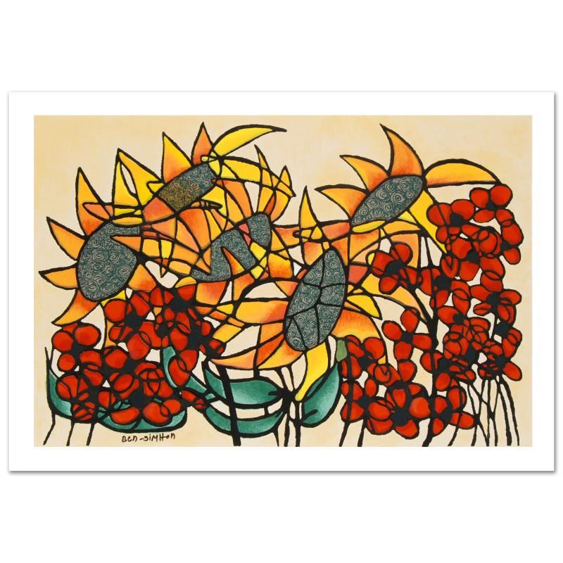 "Sunflowers" is a limited edition serigraph on paper, numbered and hand signed by Avi Ben-Simhon. Includes Certificate of Authenticity! Measures approx. 27" x 18" (with border), 29.5" x 20.5" (image).