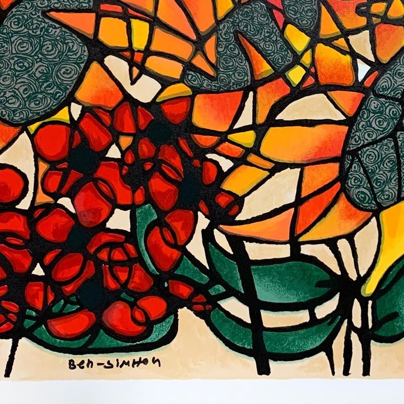"Sunflowers" is a limited edition serigraph on paper by Ben Simhon. It is numbered and hand signed and includes a letter of authenticity. Measures approximately 18" x 27" (image).