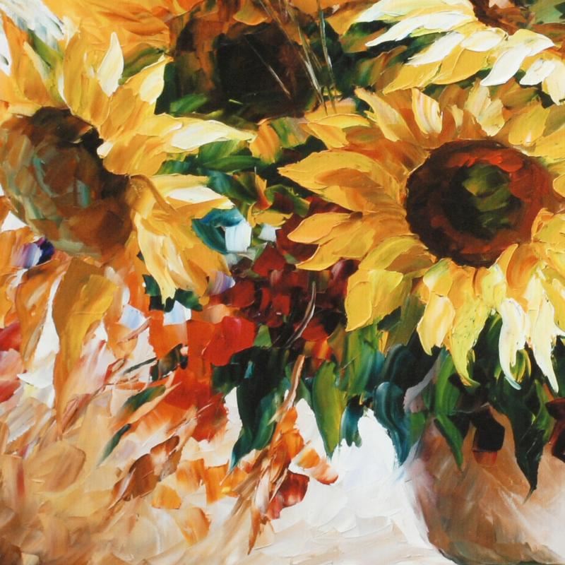 Leonid Afremov's masterful use of color and texture make his paintings unique collectibles that are sure to brighten any wall. "Sunflowers" is a limited edition giclee on stretched canvas, numbered in verso and bears Afremov's authorized signature. This piece comes gallery wrapped and ready to hang. Includes Certificate of Authenticity! Measures approx. 26.5" x 16.5" (image).