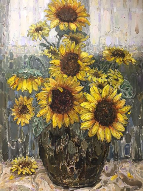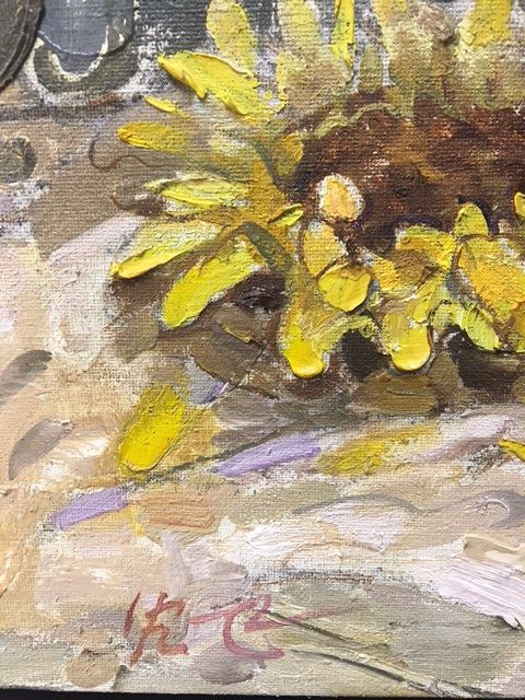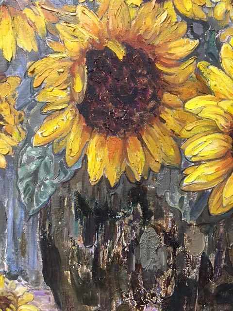 Beautiful Original Oil on canvas in heavy impasto, an homage to Vincent Van Gogh, executed in a unique modernistic style.Framed in a dark wood floater frame. Framed Size 41.5 x 33.5" approx. Canvas Size 31.5 x 23.5" approx.