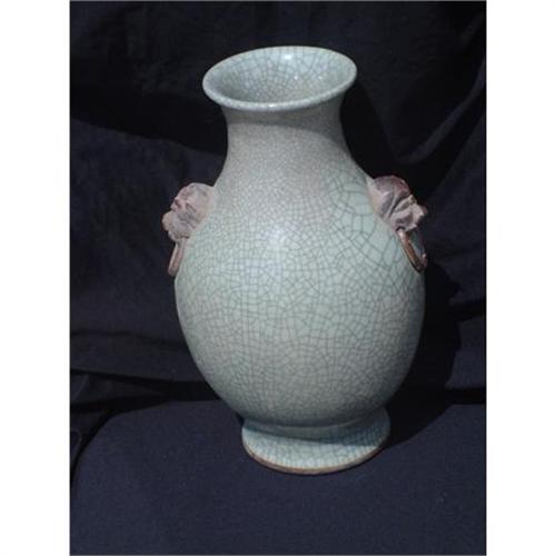 Late Sung period, large crackle celadon glaze vase with mock ring handles and lion head decorations in which the lions hold the ring in their mouths. Height: 14.5" (37 cm.). Diameter at opening: 5" (12 5 cm.). Estimated value: $5000.