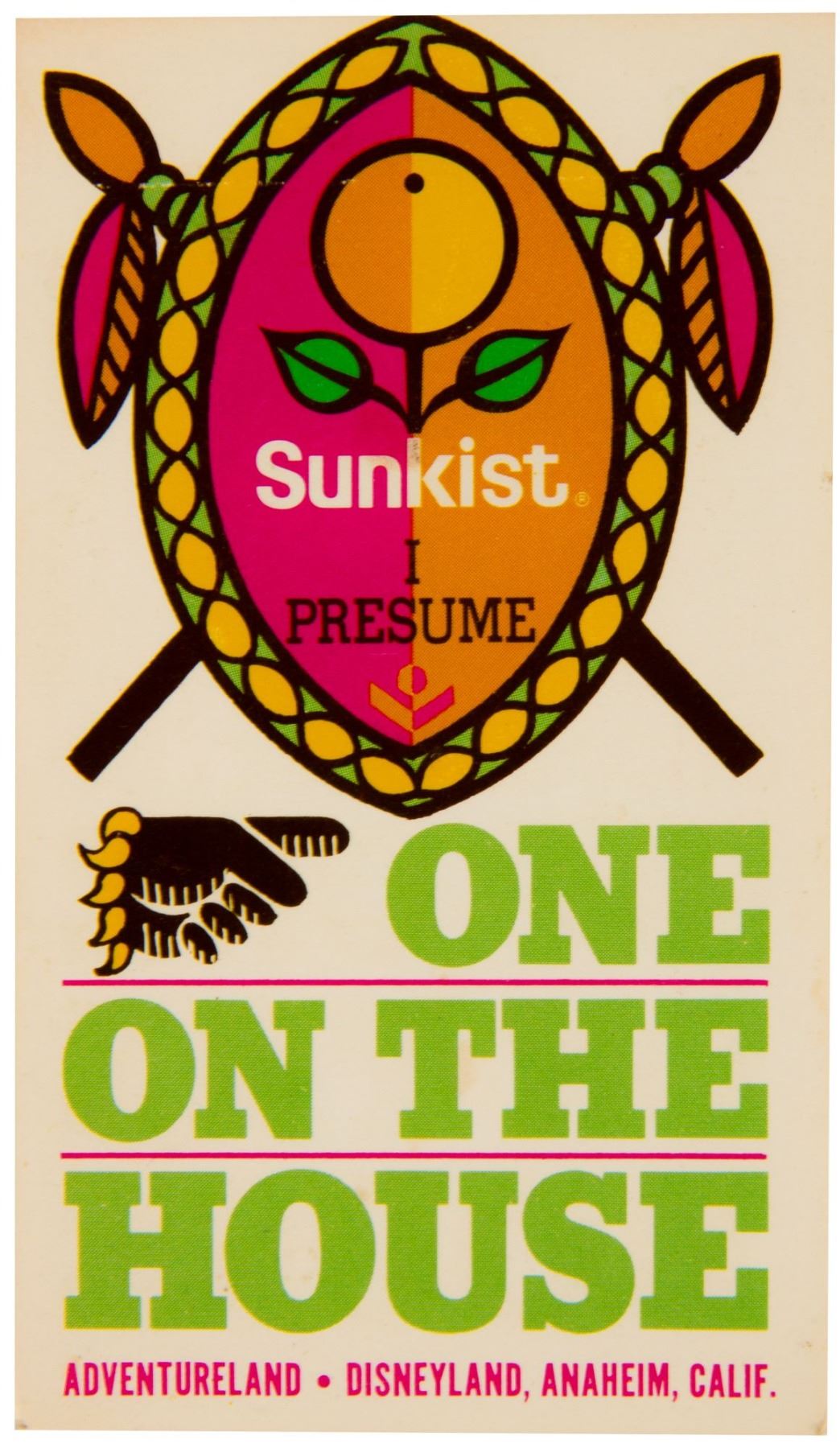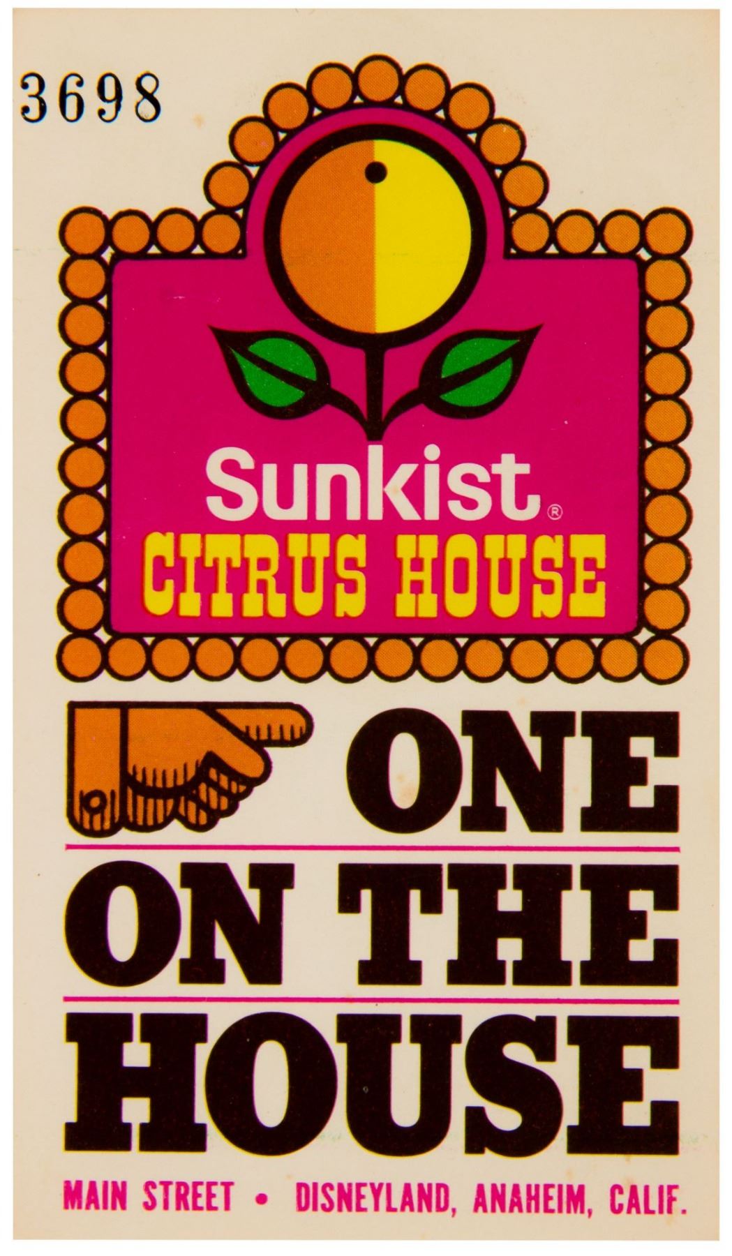 (Disneyland, c.1970s) A redemption ticket to be used at either the "Sunkist Citrus House" in Main Street or the "Sunkist, I Presume" kiosk in Adventureland. The double-sided ticket reads "One on the House" and was redeemable for a free beverage at either location. The ticket is marked as number "3698" and measures 4"x2.25". The condition is very good.