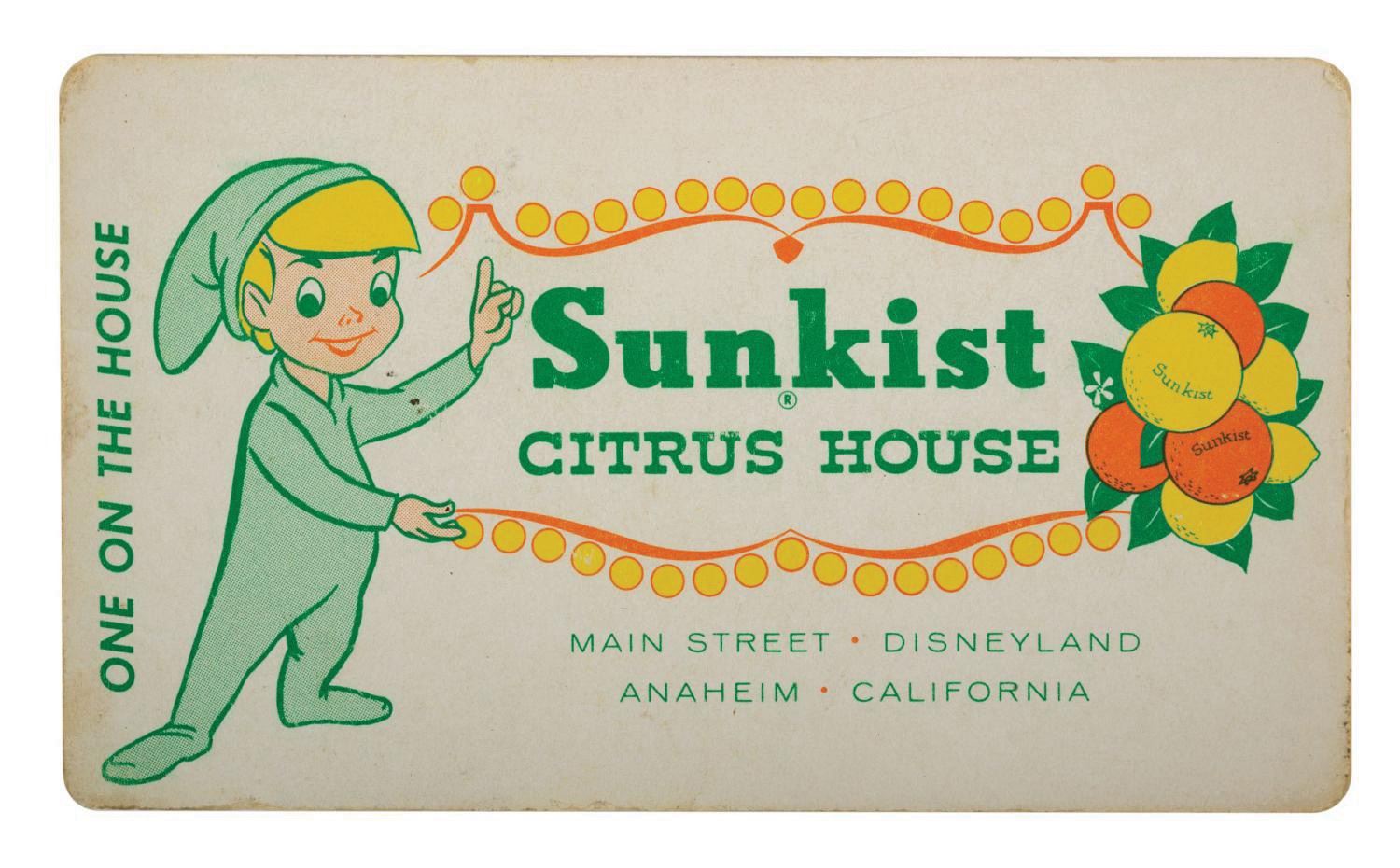 (Disneyland, c.1962-70s) An early Sunkist beverage redemption ticket. The ticket would have enabled the redemption of one Sunkist Lemonade or Sunkist Pure Orange Juice from the bars at the Sunkist I Presume or Sunkist Citrus House refreshment locations at Disneyland. Measuring approximately 2.25"x4", the card displays in very good condition, exhibiting only minor wear and a few small spots of discoloration.