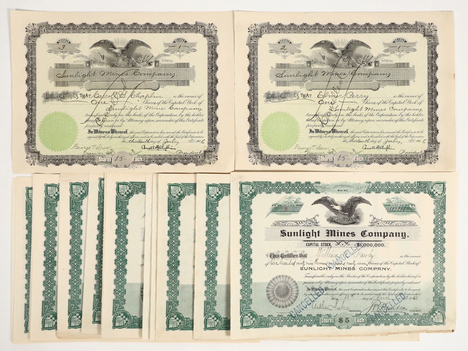 About 24 Sunlight Mines Company Stocks, 12 issued c.1906-1924. 2 early stocks with handwritten mining company name. Two varieties. 12 are unissued. Incorporated in Maine. Rare. Possibly a coal mining operation in Alabama.