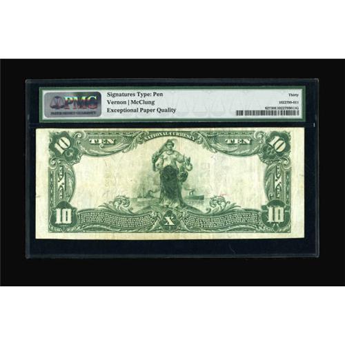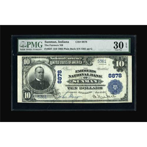 <B>Sunman, IN</B></I> - $10 1902 Plain Back Fr. 627 <B>The Farmers NB</B></I> Ch. # 8878<BR> Fresh, original paper and remaining embossing have earned this fully signed issue an Exceptional Paper Quality moniker from PMG. It has been almost two years since the last major auction offering of a large size issue from this bank. <B>PMG Very Fine 30 EPQ.</B></I><BR><BR><b>Shipping:</b> Coins & Currency (<a target="_blank" href="http://www.heritageauctions.com/common/shipping.php">view shipping information</a>)