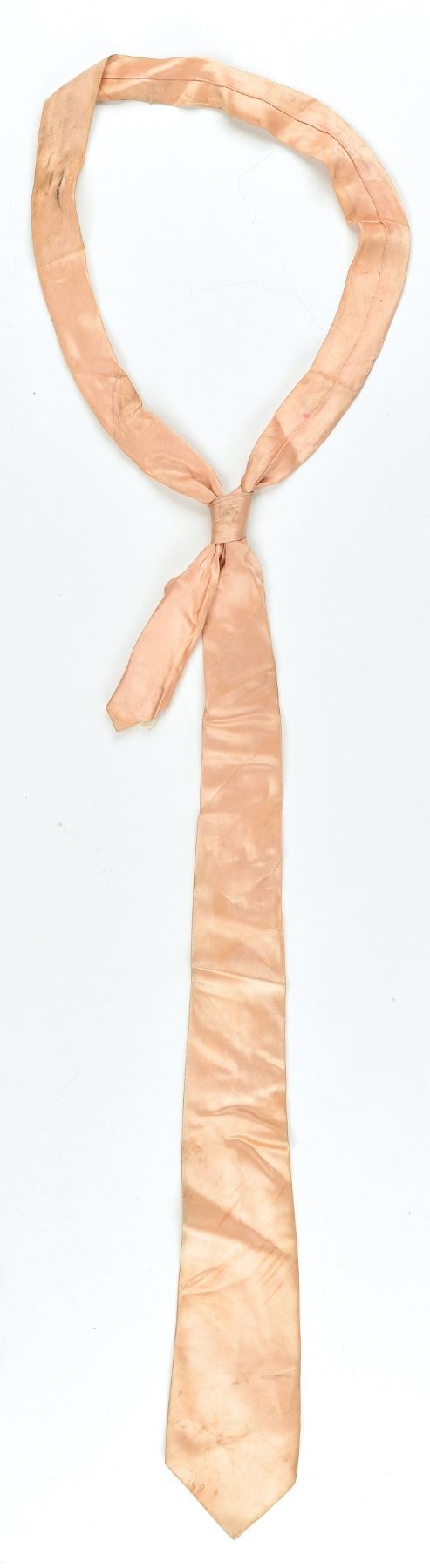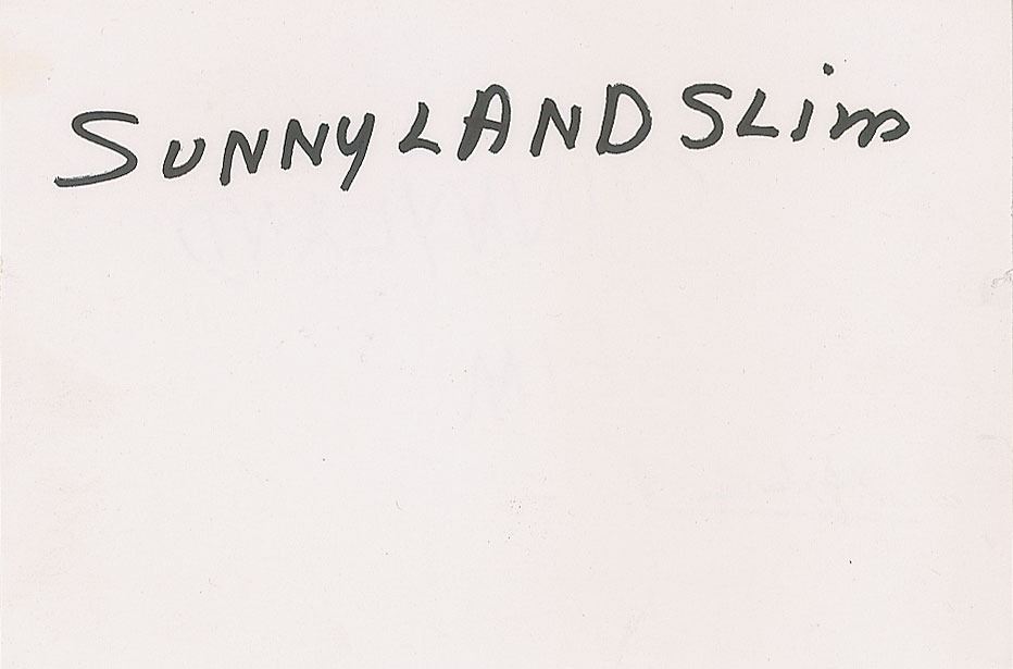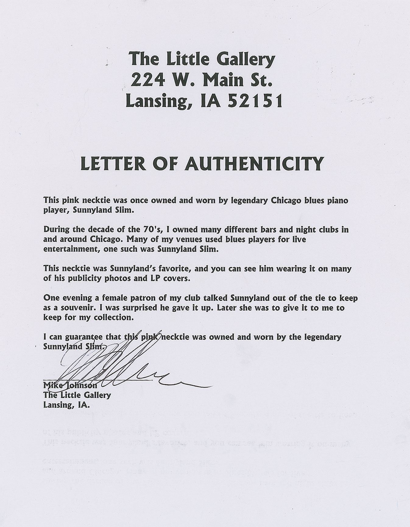 Albert Luandrew (1906–1995) known as Sunnyland Slim, was an American blues pianist who was born in the Mississippi Delta and moved to Chicago, helping to make that city a center of postwar blues. Two items: a black felt tip signature, "Sunnyland Slim," on a white 5.75 x 4 card; and a faded pink necktie personally owned and worn by Sunnyland Slim, which is accompanied by a letter of authenticity from a former owner, which reads, in part: "During the decade of the 70's, I owned many different bars and night clubs in and around Chicago. Many of my venues used blues players for live entertainment, one such was Sunnyland Slim. This necktie was Sunnyland's favorite, and you can see him wearing it on many of his publicity photos and LP covers. One evening a female patron of my club talked Sunnyland out of the tie to keep as a souvenir. I was surprised he gave it up. Later she was to give it to me to keep for my collection." In overall very good to fine condition, with expected wear to the tie.