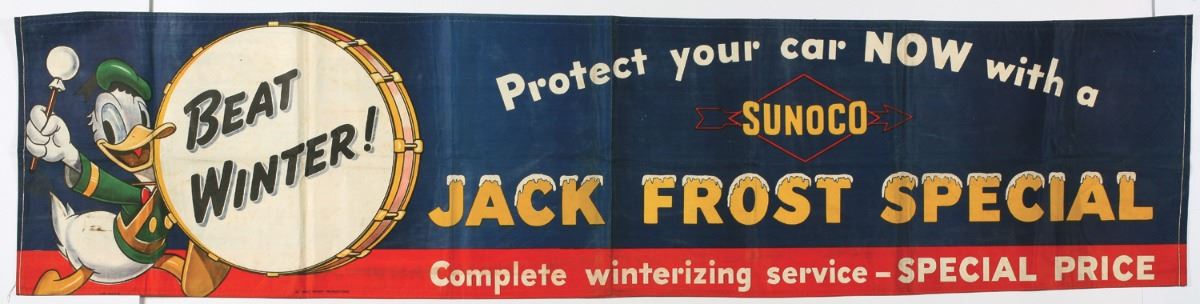 (Sun Oil Co., c.1942) Sunoco Oil "Jack Frost Special" canvas banner featuring Donald Duck. The banner measures 20"x 90" and is in very good condition with some wear from use.