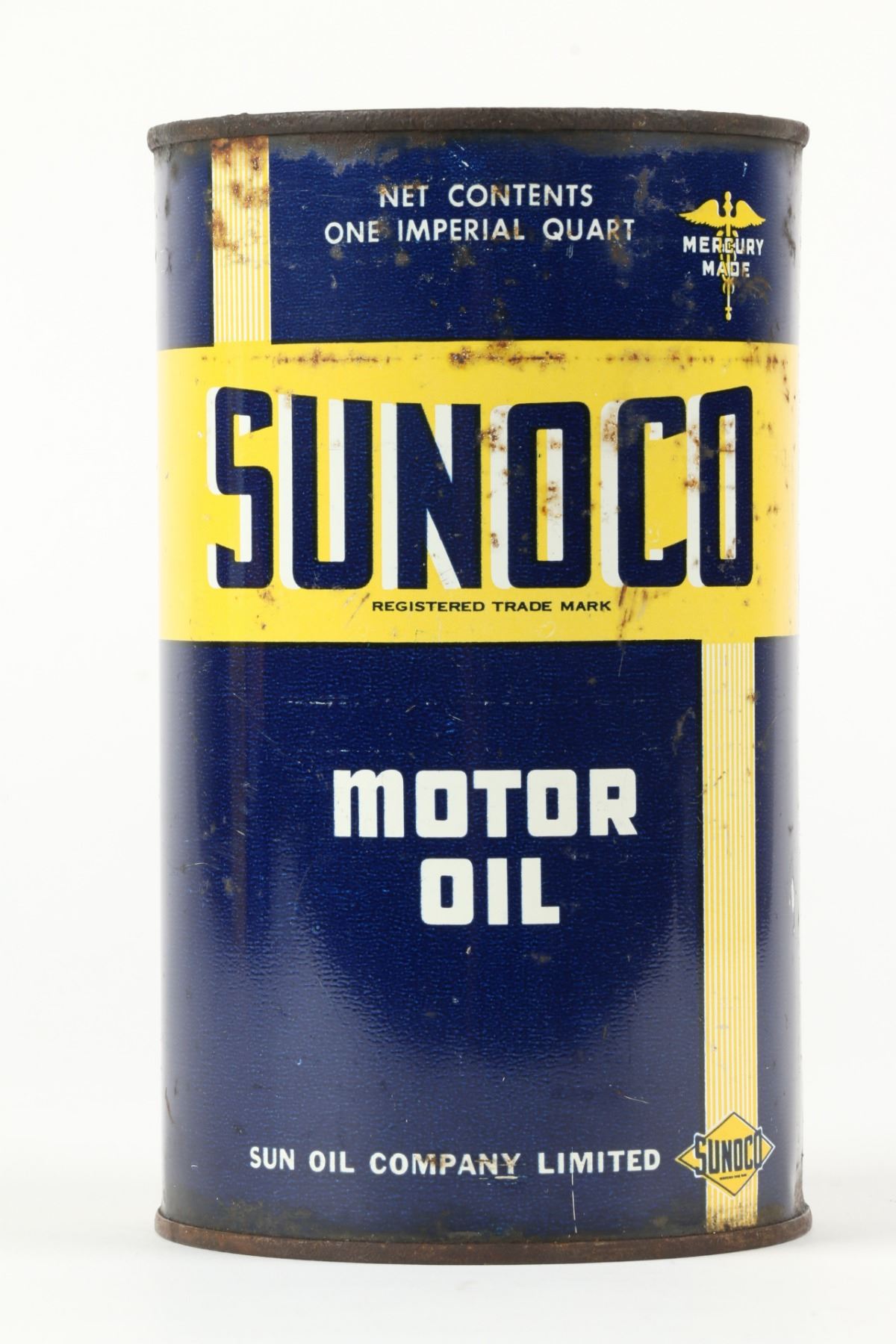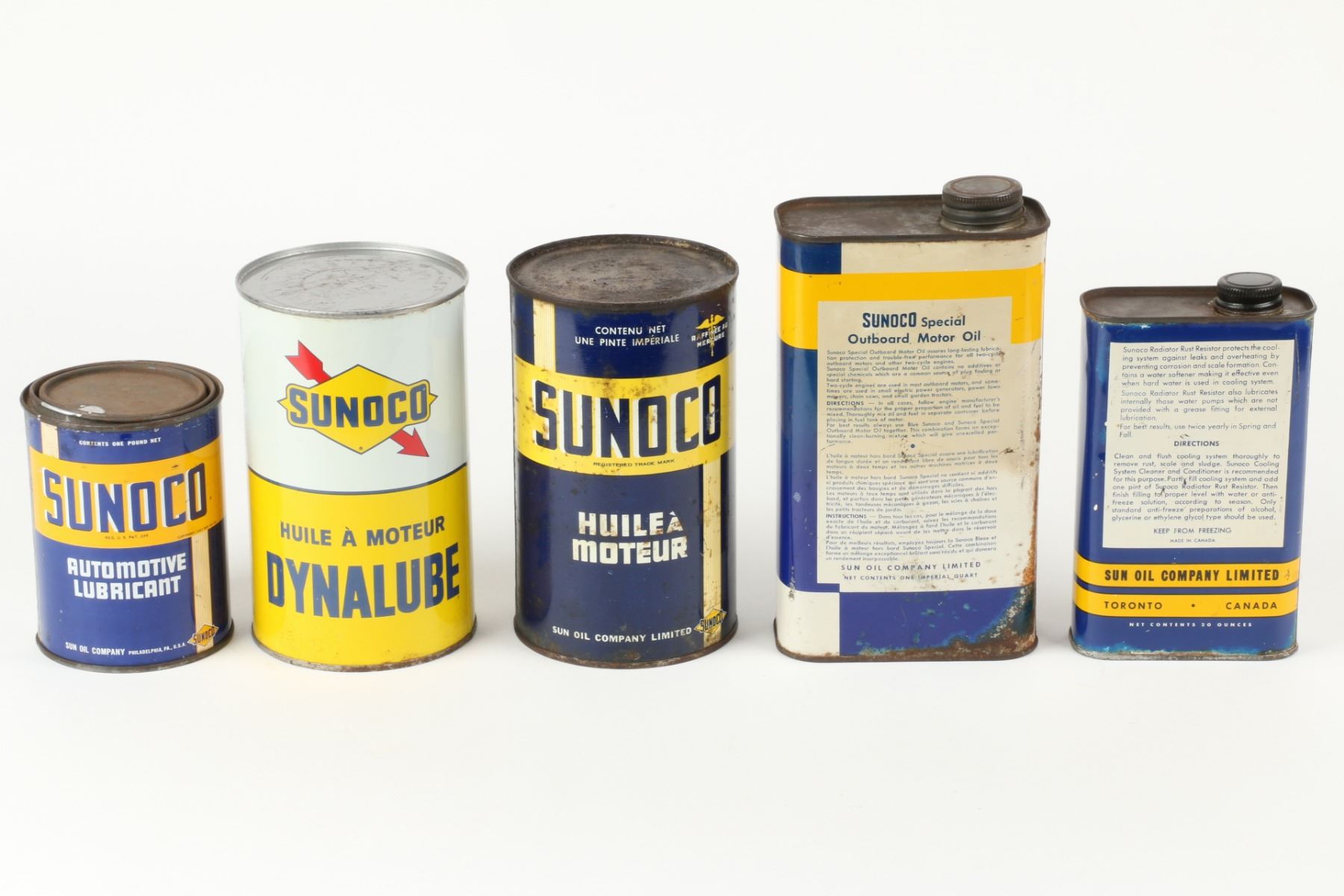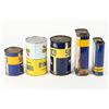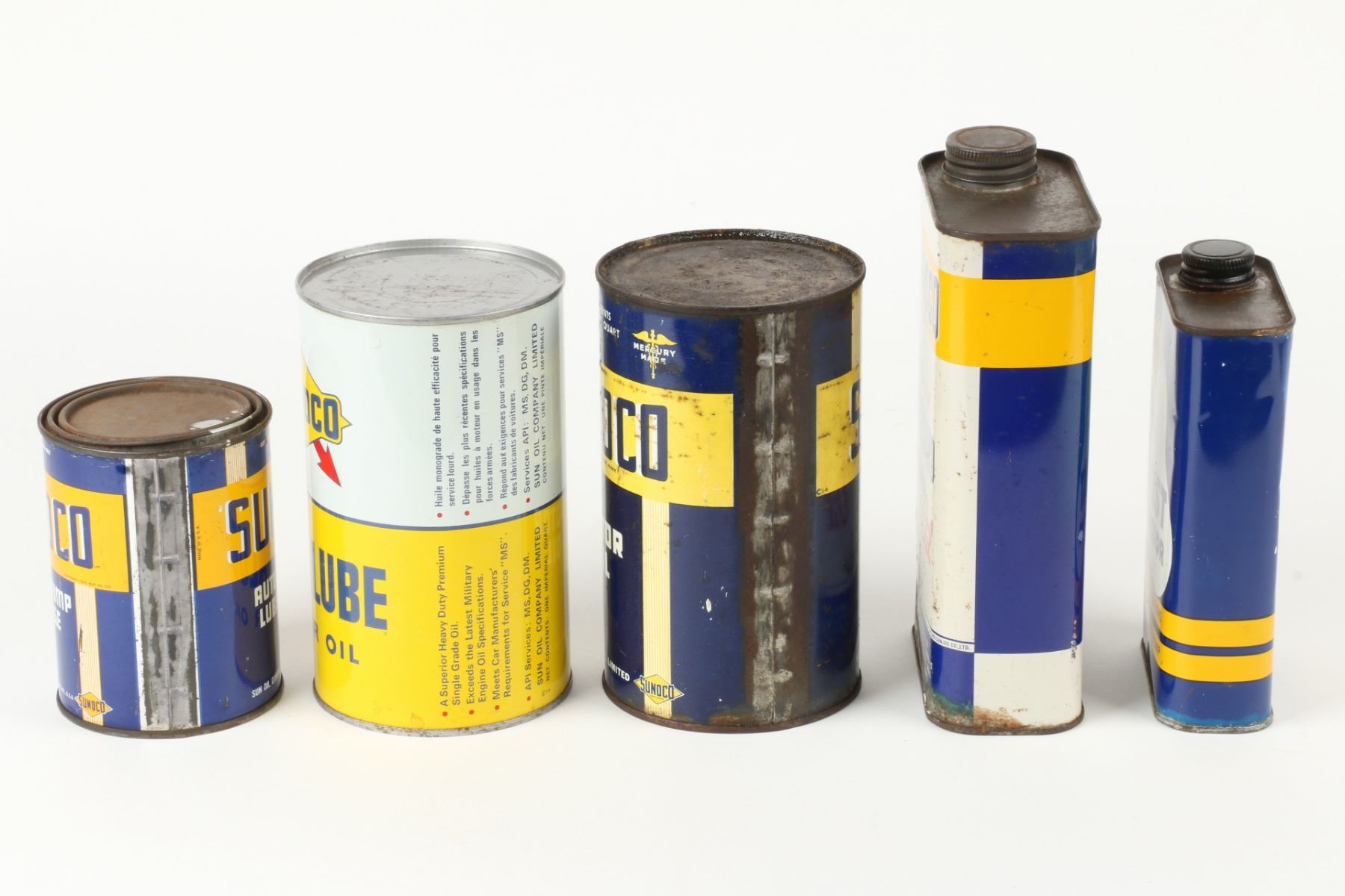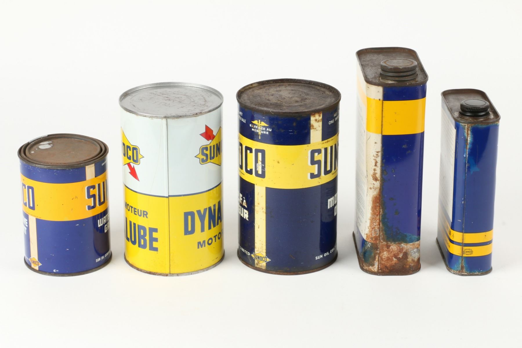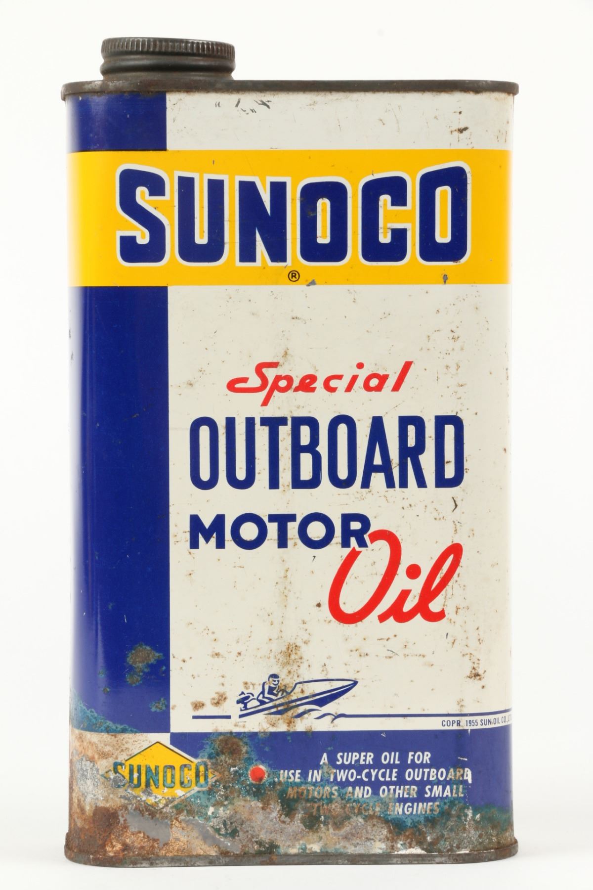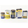 Five (5). Outboard motor (quart), auto lubricant (1 lb.), rust resistor and 2 motor oil cans (quart). Motor oil quart shows significant loss at bottom and side. General wear, oxidization. $200-300.