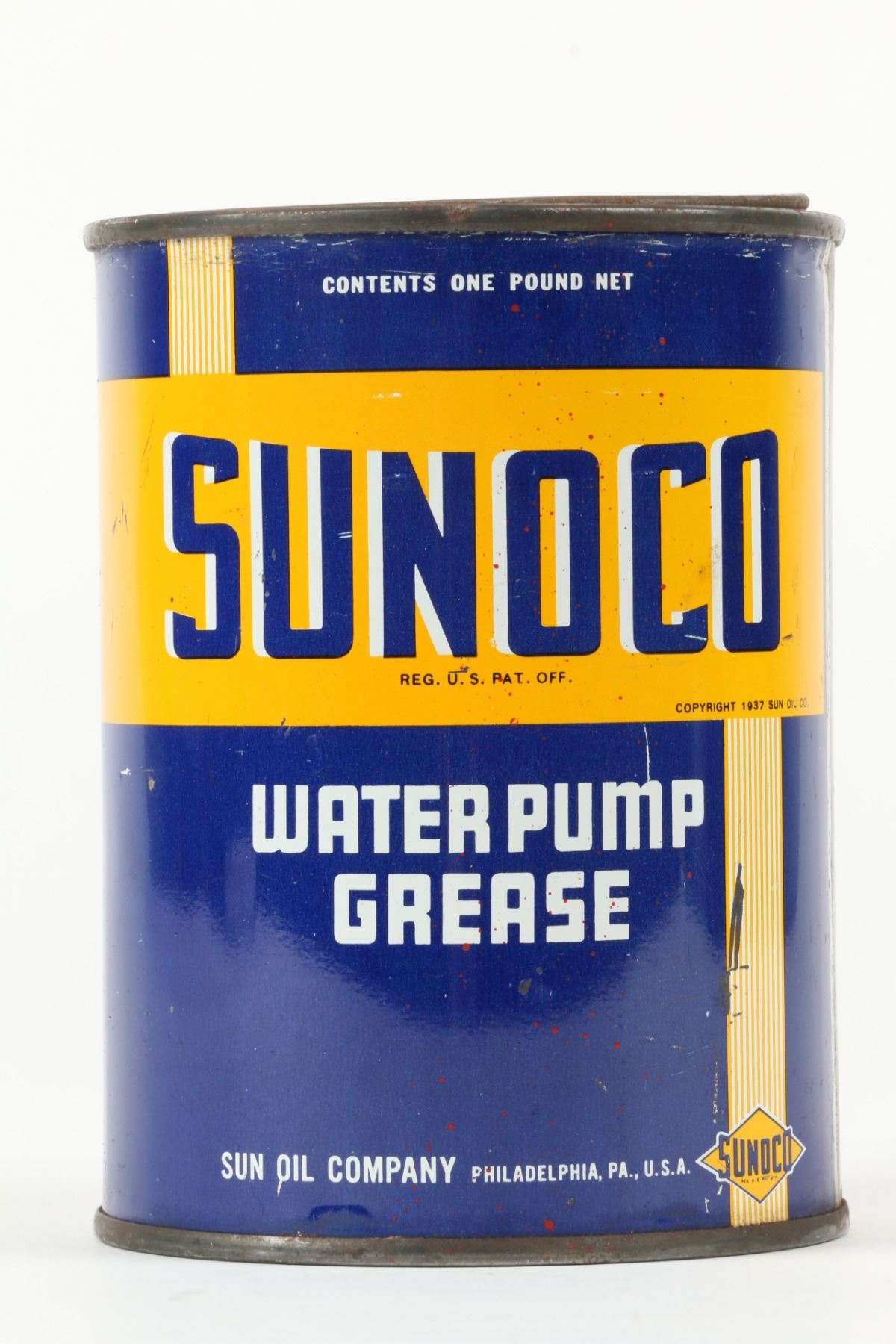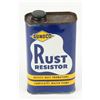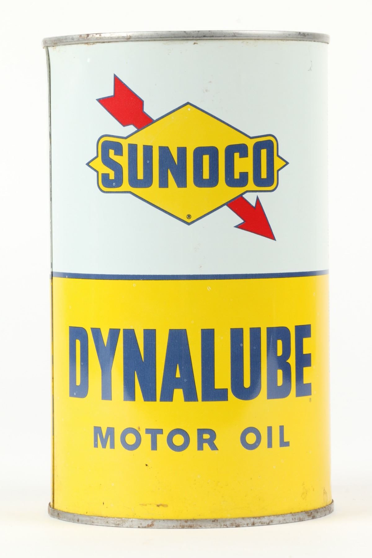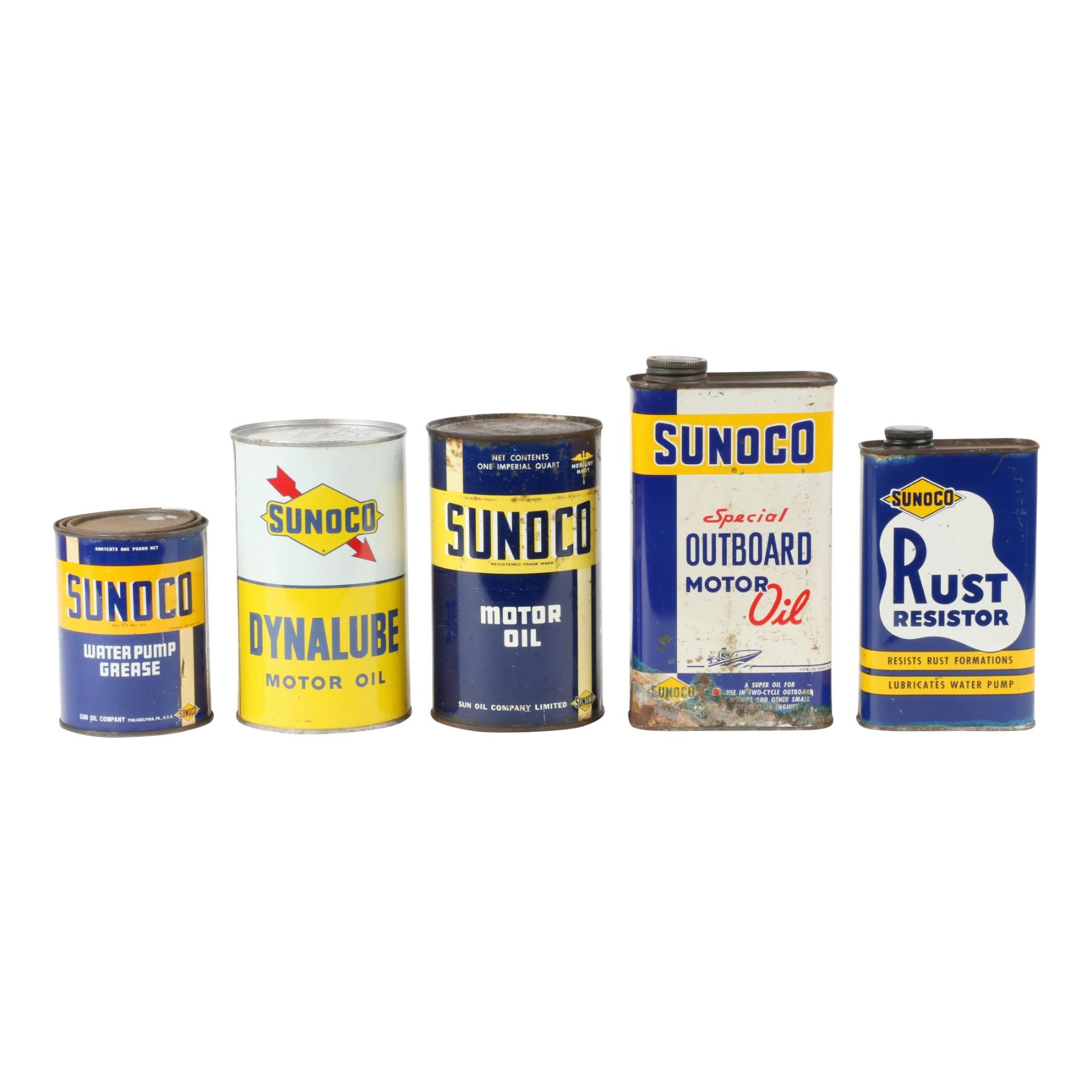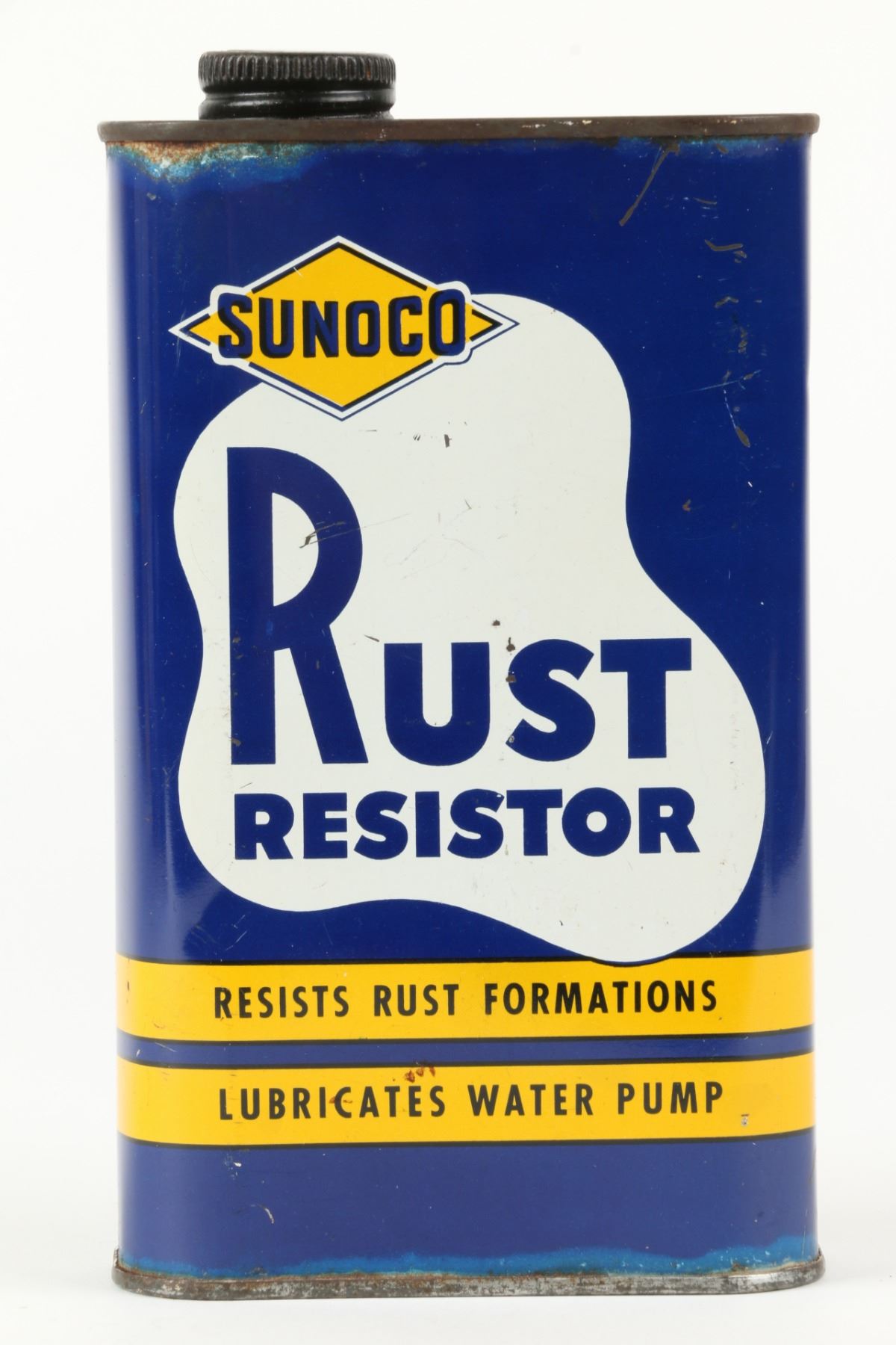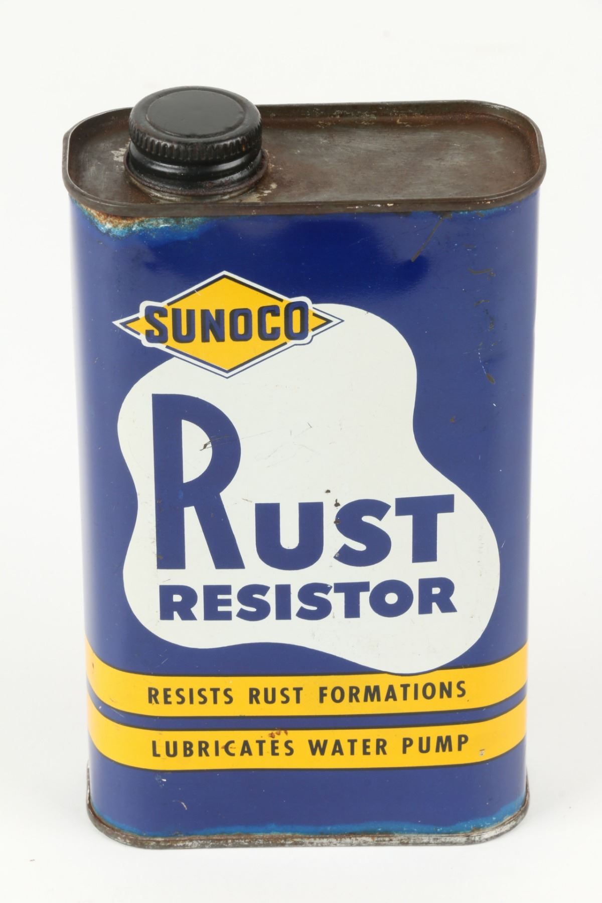 Five (5). Outboard motor (quart), auto lubricant (1 lb.), rust resistor and 2 motor oil cans (quart). Motor oil quart shows significant loss at bottom and side. General wear, oxidization. $200-300.