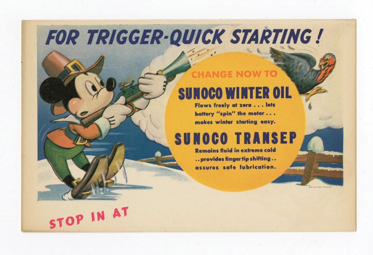 (Sun Oil Co., 1939) Sunoco oil promotional postcard featuring Mickey Mouse. Measures 3.5"x5.5". In very good condition with minor edge discoloration.