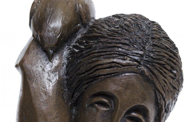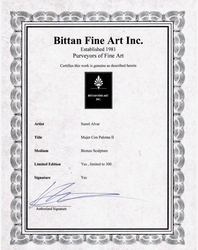 Sunol Alvar "Mujer Con Paloma II" Bronze Sculture. Size: app 5.75" x 9" x 5" Edition Size: 300. Signed and numbered, comes with COA. W3451