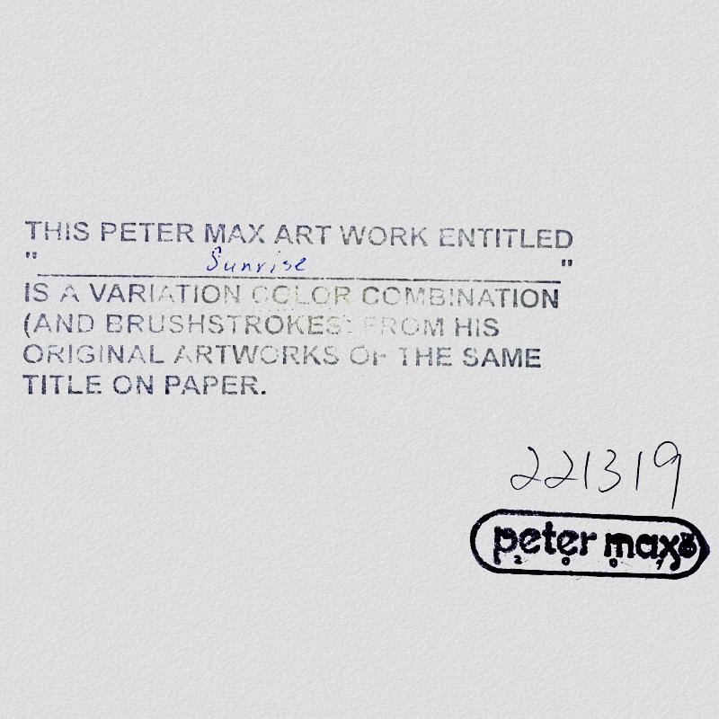 "Sunrise 2000" is a one-of-a-kind mixed media on paper, hand signed by Peter Max. The piece comes custom framed with a backside cutout to display Peter Max Studio registration number 221319 certifying authenticity. Measures approximately 48" x 36" (frame), 36" x 24" (image). This item requires special handling and may have a longer than usual turnaround.
