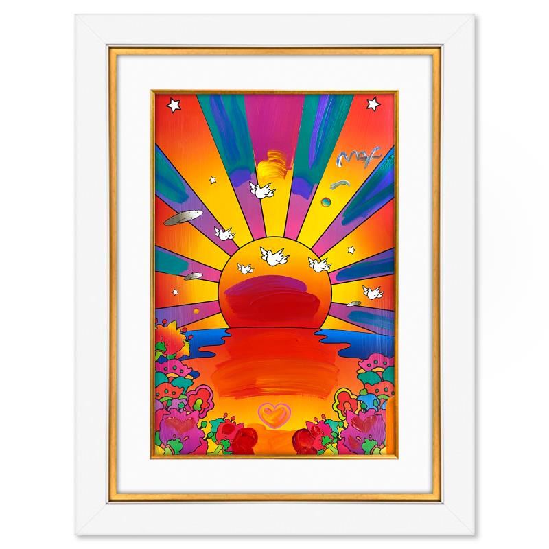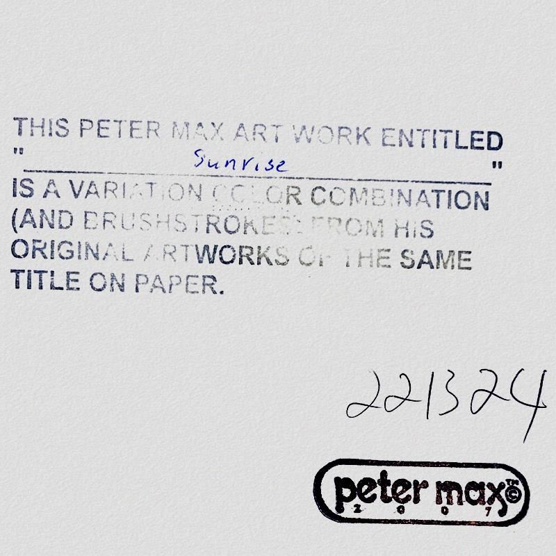 "Sunrise 2000" is a one-of-a-kind mixed media on paper, hand signed by Peter Max. The piece comes custom framed with a backside cutout to display Peter Max Studio registration number 221324 certifying authenticity. Measures approximately 48" x 36" (frame), 36" x 24" (image). This item requires special handling and may have a longer than usual turnaround.