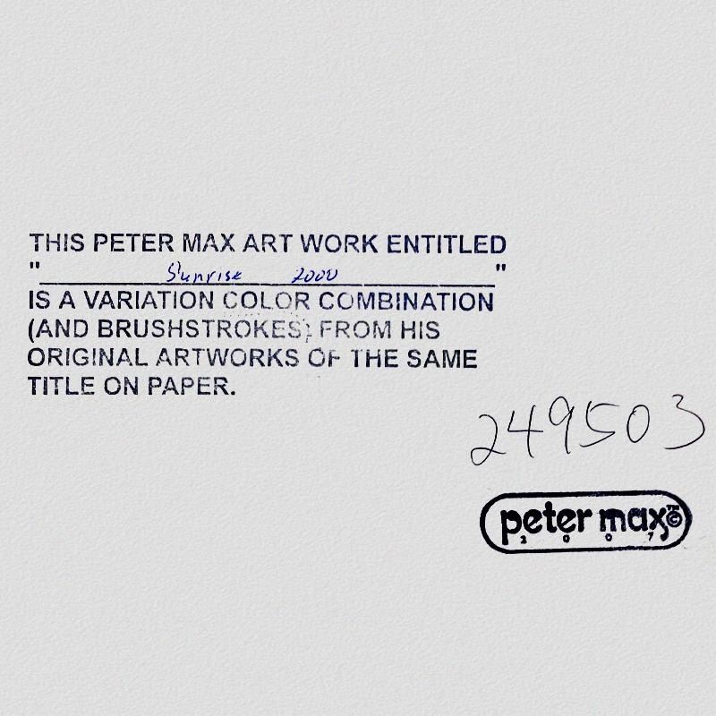 "Sunrise 2000" is a one-of-a-kind mixed media on paper, hand signed by Peter Max. The piece comes custom framed with a backside cutout to display Peter Max Studio registration number 249503 certifying authenticity. Measures approximately 48" x 36" (frame), 36" x 24" (image). This item requires special handling and may have a longer than usual turnaround.