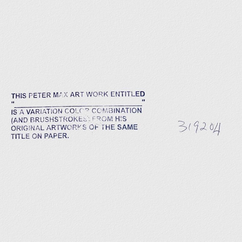 "Sunrise 2000" is a one-of-a-kind mixed media on paper, hand signed by Peter Max. The piece comes custom framed with a backside cutout to display Peter Max Studio registration number 319204 certifying authenticity. Measures approximately 42" x 30" (frame), 36" x 24" (image). This item requires special handling and may have a longer than usual turnaround.