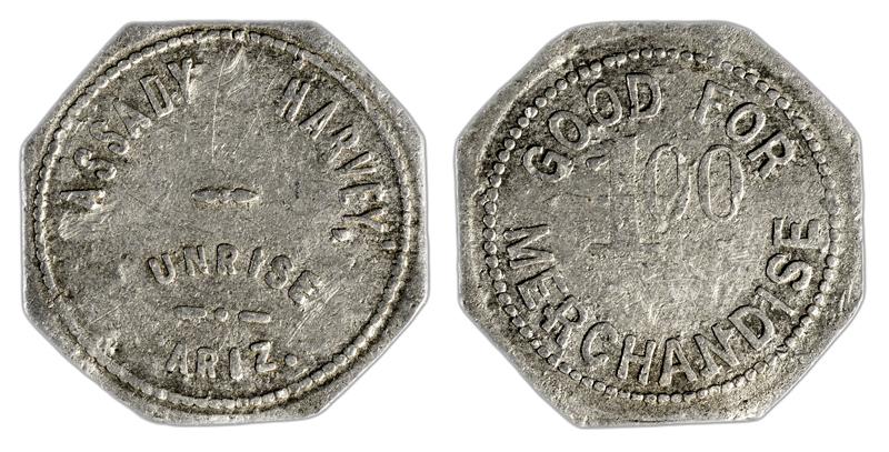 Obverse: Cassady & Harvey / Sunrise, / Ariz.; reverse: Good For / 1.00 / In / Merchandise. Al, 33mm, R9. Fine condition.