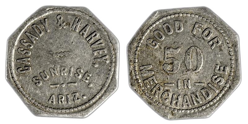 Obverse: Cassady & Harvey / Sunrise, / Ariz.; reverse: Good For / 50 / In / Merchandise. Al, 30mm, R9. Fine condition.