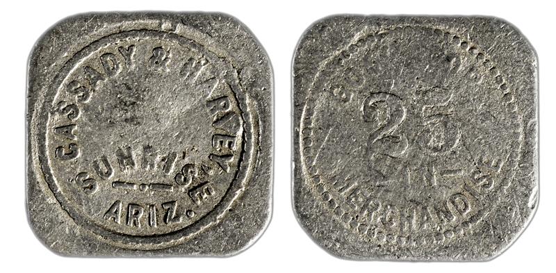Obverse: Cassady & Harvey / Sunrise, / Ariz.; reverse: Good For / 25 / In / Merchandise. Al, 27mm, R9. Good condition.