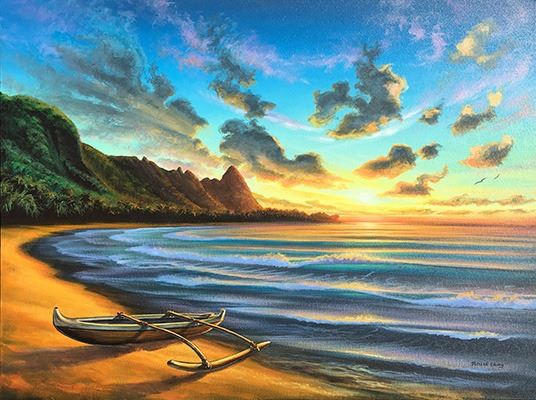 The spectacular Hawaiian sunset blesses the ocean and Mount Makana with a golden glow. A Hawaiian outrigger canoe returns from a long day at sea.