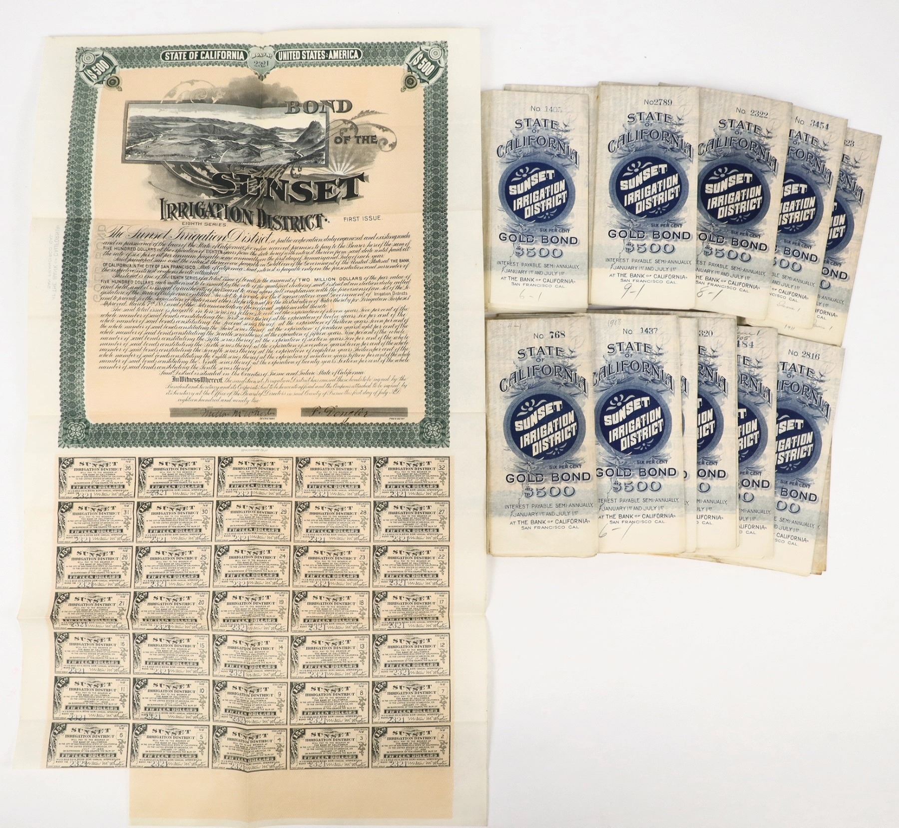 Lot of (16). Extra large fold-out sheet, $500 Gold Bonds issued by the Sunset Irrigation District, with (36) $15 coupons. Labeled as First Issue, Eighth Series. These sheets measure 27"x15.5" when fully extended. Please note some of the coupons have been removed from the various notes. Coupons have ascending dates of maturity printed on them. Great vignette above the titles inn the header section. These are in good to very good condition overall, with minor fold issues with the cut coupons on certain certificates. The Sunset Irrigation District was located near Fresno. Unique group, please see photos.