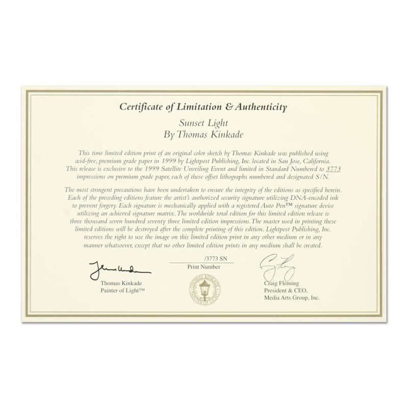 "Sunset Light" is an Offset Lithograph on paper by Thomas Kinkade (1958-2012), numbered and bearing Kinkade's authorized signature. Includes Letter of Authenticity. Measures approx. 20" x 16" (border), 16" x 12" (image).