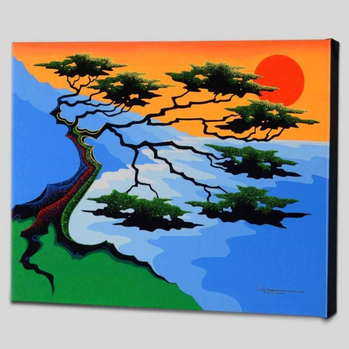 Larissa Holt, a student of distinguished artist Eyvind Earle(1916-2000), uses bold colors and breathtaking scenery to create images of Nature in her own unique style. "Sunset" is a limited edition giclee on stretched canvas by Holt, numbered and bearing Holt's authorized signature. This piece comes gallery wrapped. Includes Letter of Authenticity. Measures approx. 12.5" x 10" x 1.5" (image).