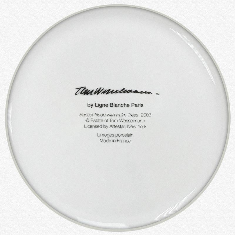 "Sunset Nude with Palm Trees (2003)" is a Limoges porcelain plate bearing the plate signature inverso of Tom Wesselmann (1931-2004). This plate is custom framed and floated on linen. Measures approx. 13.5" x 13.5" (frame), 8.5" (plate diameter).