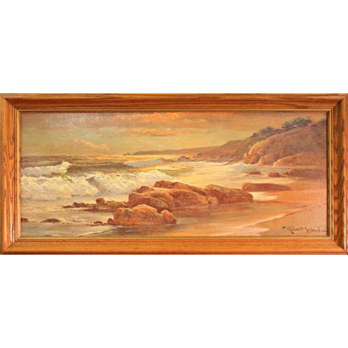 The very prolific artist, Robert Wood, created such an output of work through his lifetime that he was the best-known landscape artist in America for a number of decades. He was originally born in 1889 in Sandgate, England, near the cliffs of Dover, and at an early age demonstrated a propensity for art. After studying at nearby Folkstone and serving in the Royal Army, Wood and his friend, Claude Waters, emigrated to America. In the 1920s, Wood signed a contract that gave him royalties in exchange for the rights to reproduce his images. From there, millions of reproductions were sold, making him very wealthy and famous. From his many trips crisscrossing the American continent, he presented us with a record of the unspoiled American landscape. In a very real sense, his paintings are an invaluable document of our rapidly vanishing wilderness and pristine seashores. Whether it was a maritime painting depicting Pt. lobos, a landscape showing Texas bluebonnets in full bloom, or a view of the Rocky Mountains, Wood handled each of these with a talent all his own. Wood continued to paint up to his death in 1979, just weeks before his 90th birthday.