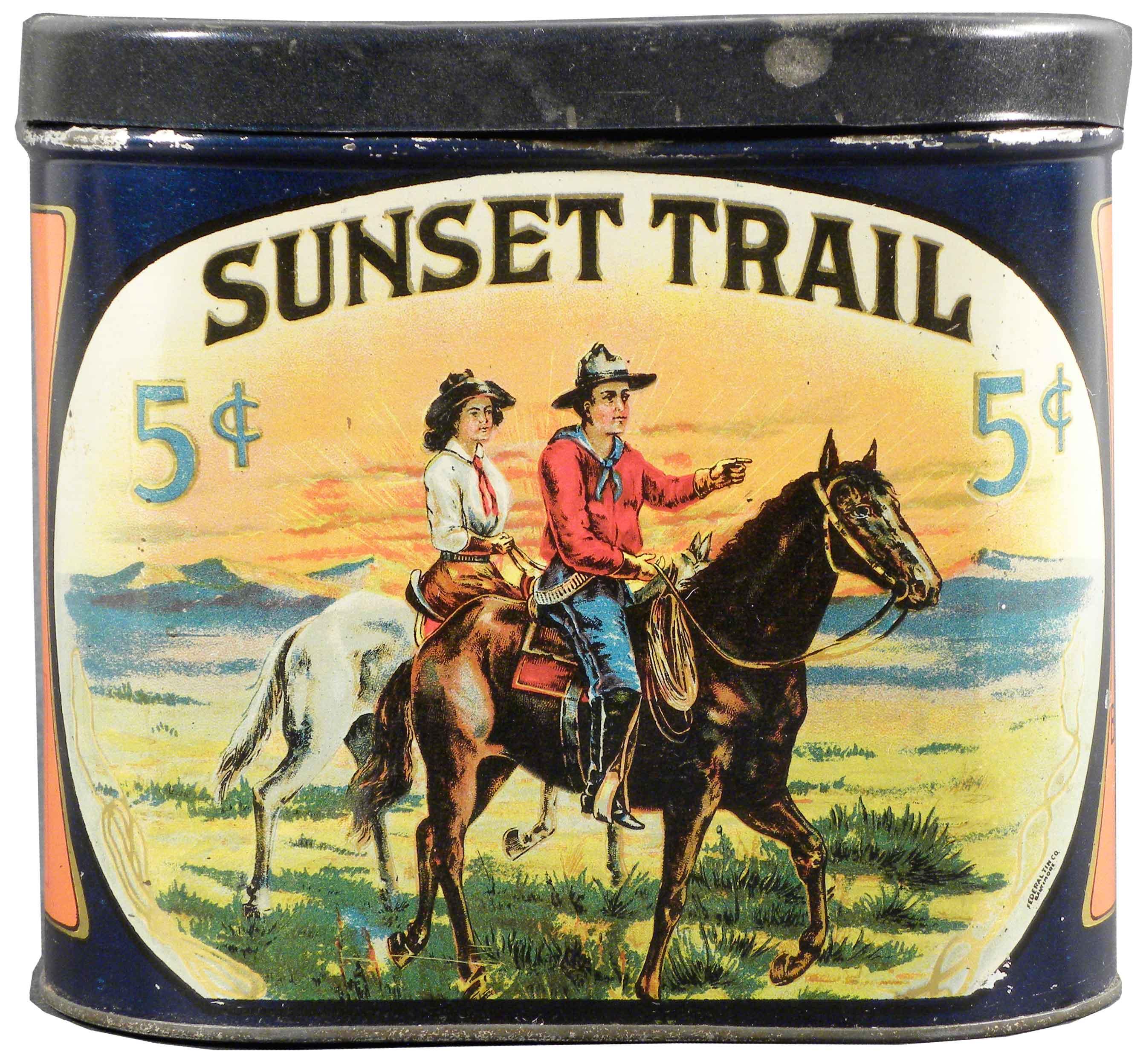 Sunset Trail Cigar Tin, 5 Cents. Manufactured by The Roby Cigar Co. Barnsville, Ohio. Stamped Factory No. 854 18th Dist. O. Excellent condition.