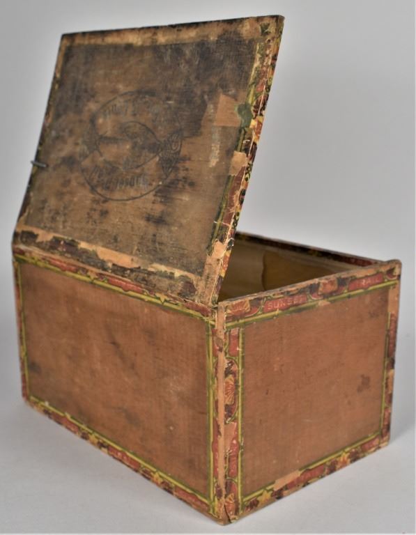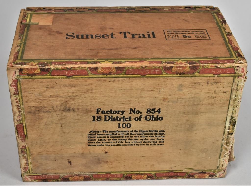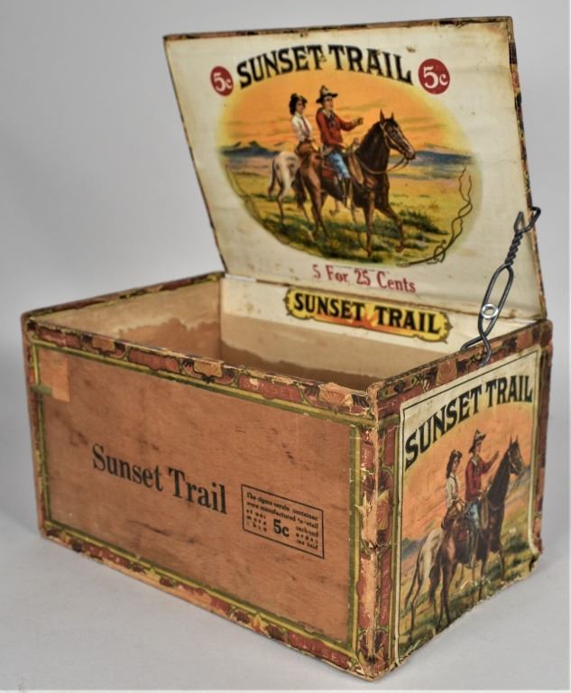 Sunset Trail Wood Cigar Box. Roby Cigar Co. Beautiful western americana image interior and side paper labels. Some staining and edgewear. 8 1/2 X 4 3/4 X 5 1/2 inches.