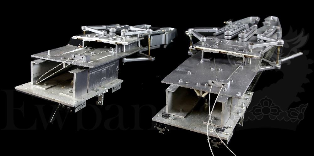 † Sunshine (2007) Pair of large miniature Icarus II Docking Reciever Clamps. Seen when the Icarus II docks with the Icarus I via their respective air locks. Constructed of resin and metal, both miniatures are fully articulated with wire operational functionalities. Please note that VAT is payable on top of the hammer price at 20% in addition to standard buyers premium inc. VAT for this lot.