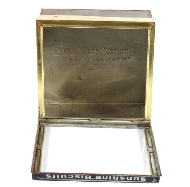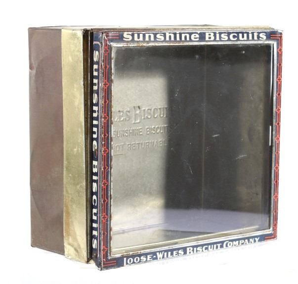 Featured in this lot we have a Sunshine Biscuit counter top display case originating from the early 20th century. The case was manufactured by Loose-Wiles Biscuit Company, the company was founded in 1902 in Kansas City and later spread to Boston and New York. The case is marked "Sunshine Biscuits" and "Loose-Wiles Biscuit Company" in numerous places, along with other markings. The piece shows steel construction with a glass front and was used as a counter display case for stores. Overall, the case shows good condition with some wear indicative of age. The display case measures 9 1/4" wide by 8 1/2" tall and 4 3/4" deep.