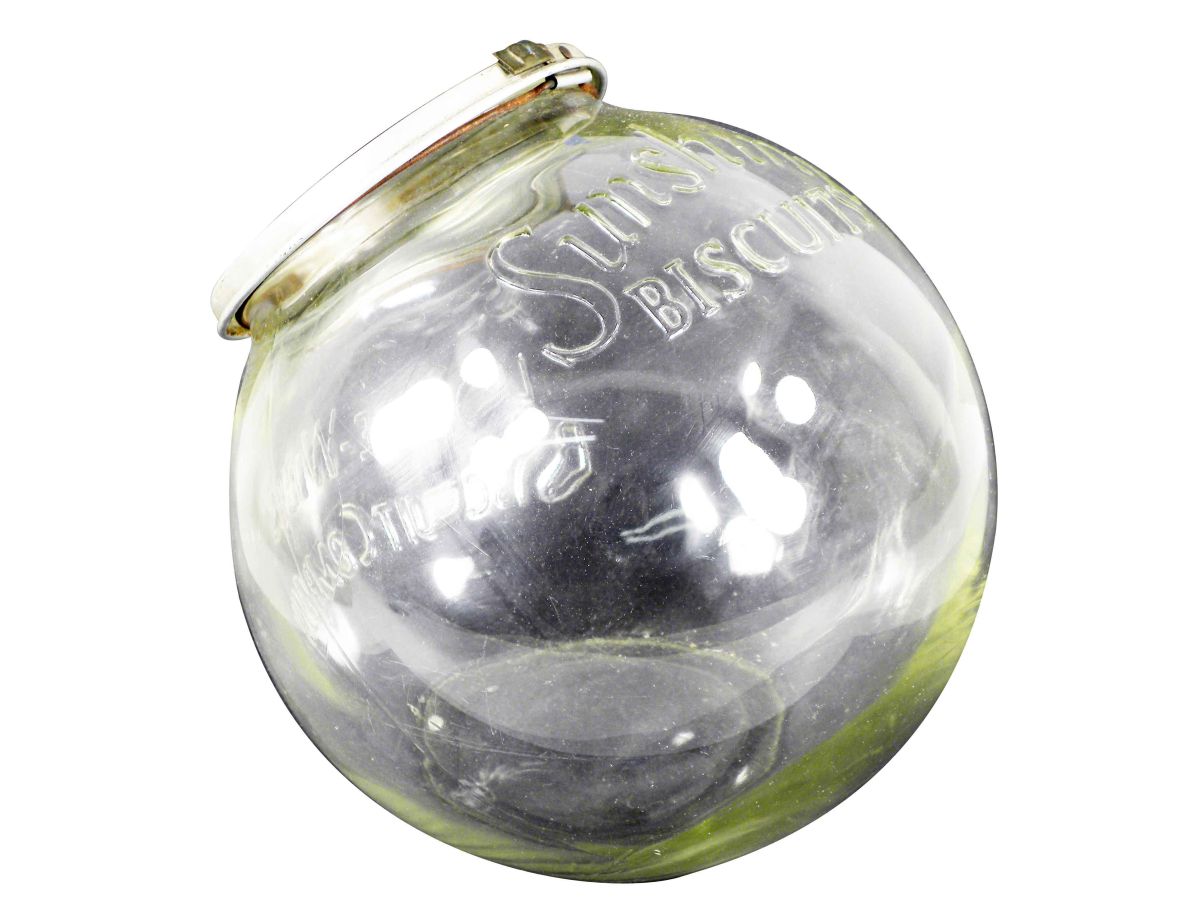 Sunshine Biscuits Glass Store Jar w/original aluminum lid. No chips or cracks. 10 inch diameter X 11 inches tall.