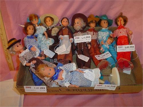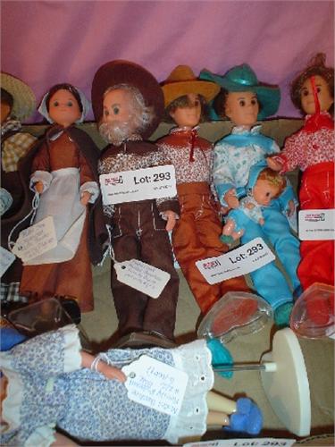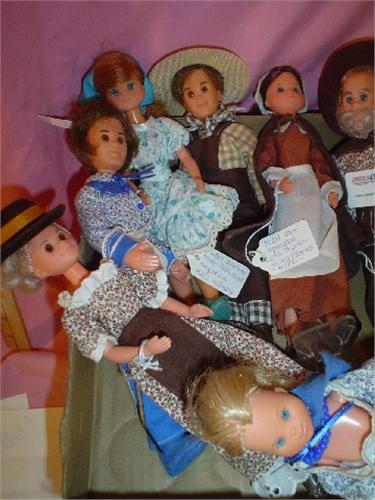 "The Sunshine Family" by Mattel, Box of 10 Dolls, All Re-Dressed: #1/2 Red, #1/4 Brown, #2/4 Brown, #1/2 Blue, #1/2 Turquoise w/Baby, #2/2 Turquoise Dress (Missing Baby), #2/2 Blue (Missing Baby), #2/2 Grandparents Brown, #1/2 Grandparents Brown & "Star Spangled" Dolls by Mattel: Thanksgiving Pilgrims #2/2. Some of these have Stands