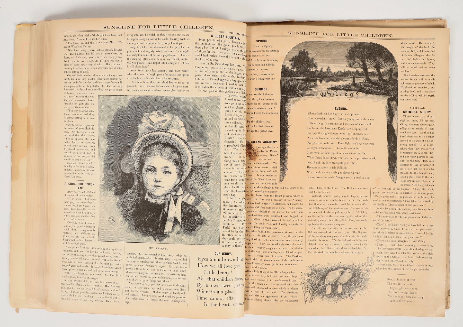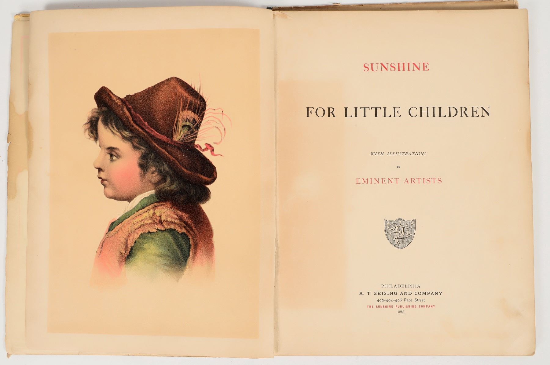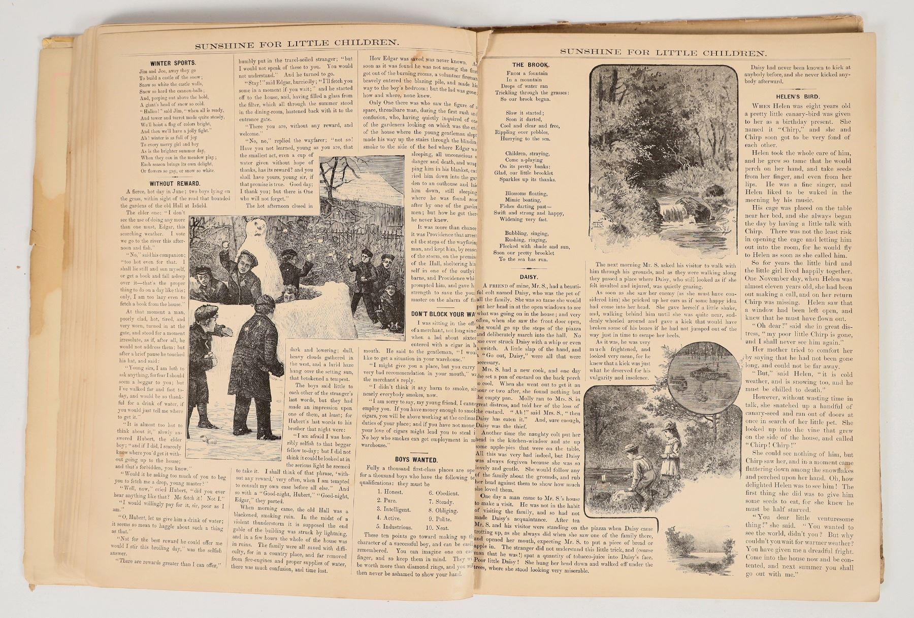 Sunshine For Little Children. A. T. Zeising  publisher. 1883, 80 pages,10x14" lots of illustrations and stories. Colorful , well Illustrated cove and inside page. . Back cover: full color ad for Bates, Reed & Cooley, of New York., dry good dissolved in 1885.  Shows signs of age, binding is separating.  Inside pages are complete and good, readable cond.