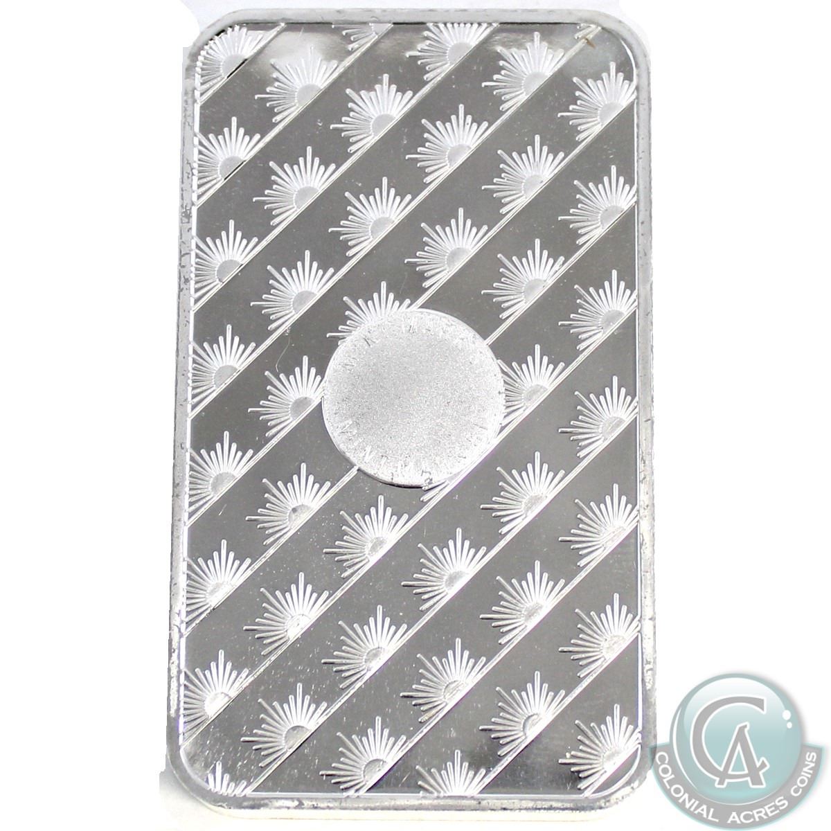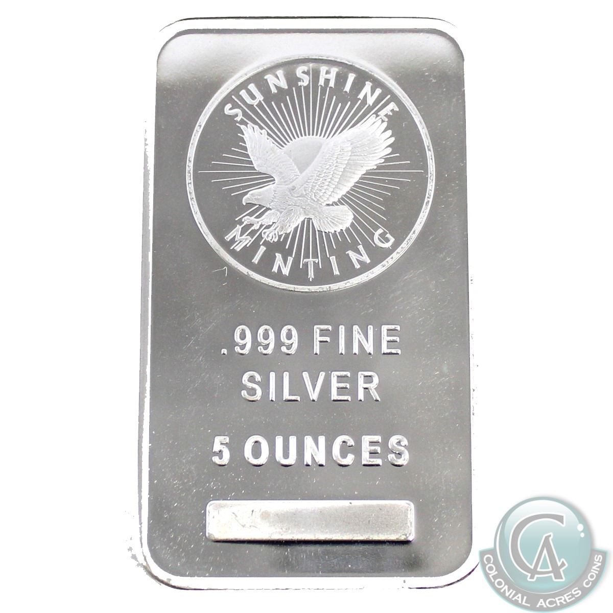 Sunshine Mint 5oz .999 Fine Silver Bar (TAX Exempt) with Mint Mark security logo on the reverse.