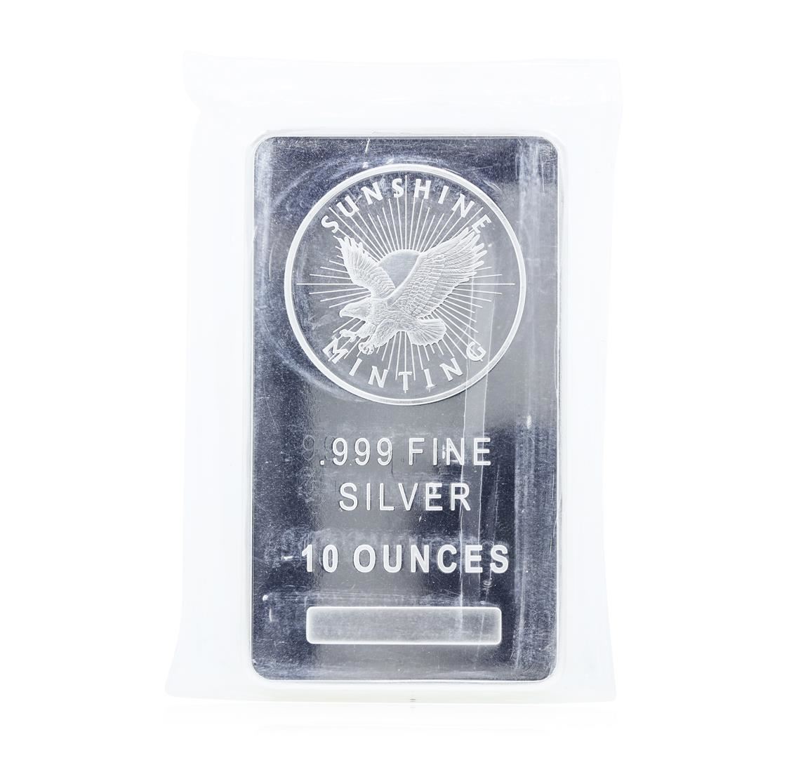 One ten ounce .999 fine silver bar from Sunshine Minting.