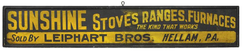Sunshine Stove sign-Sold by Leiphart Bros-Hellam, PA, primitive wooden sign in VG/Exc cond, c.1890's, 6.5"H x 36"W.