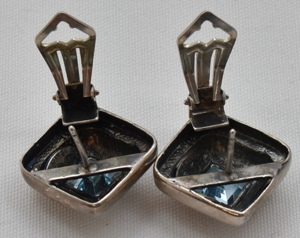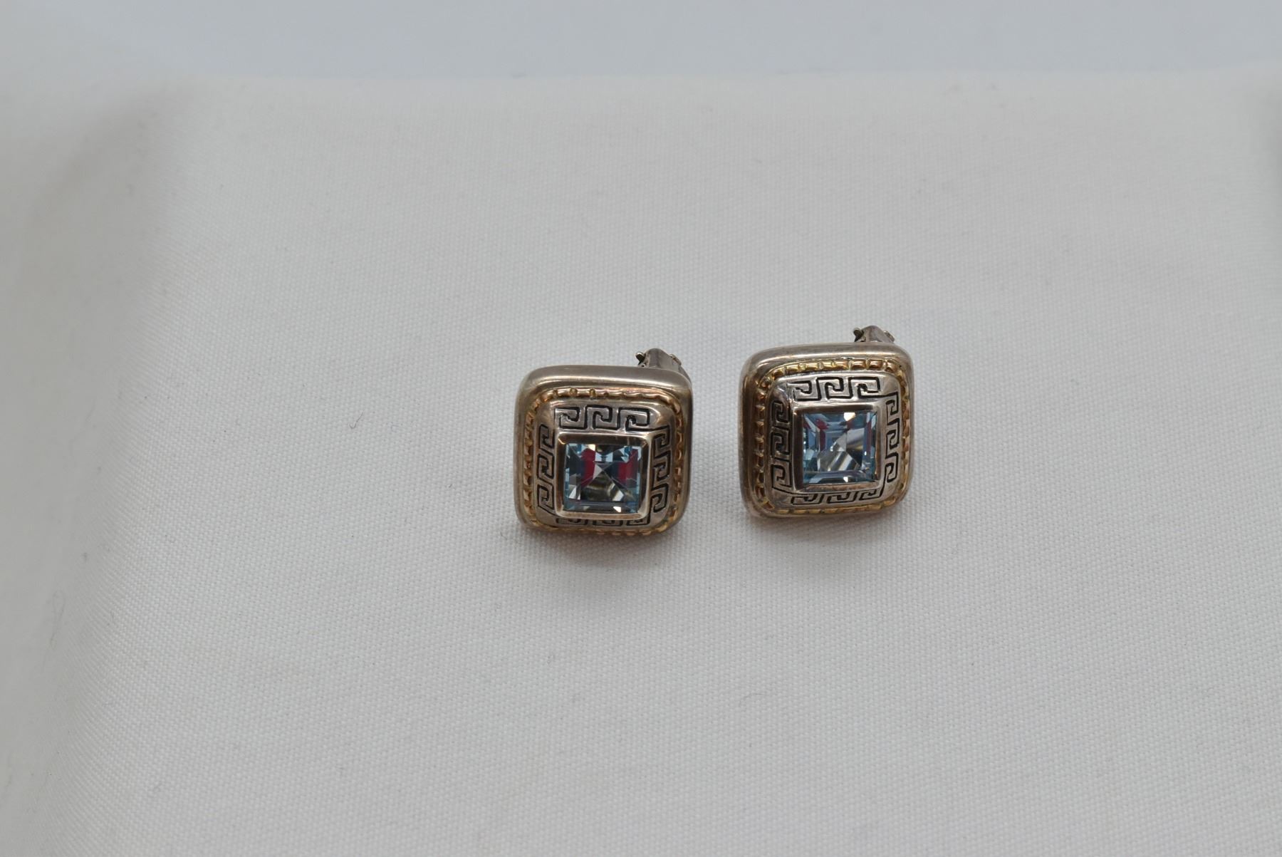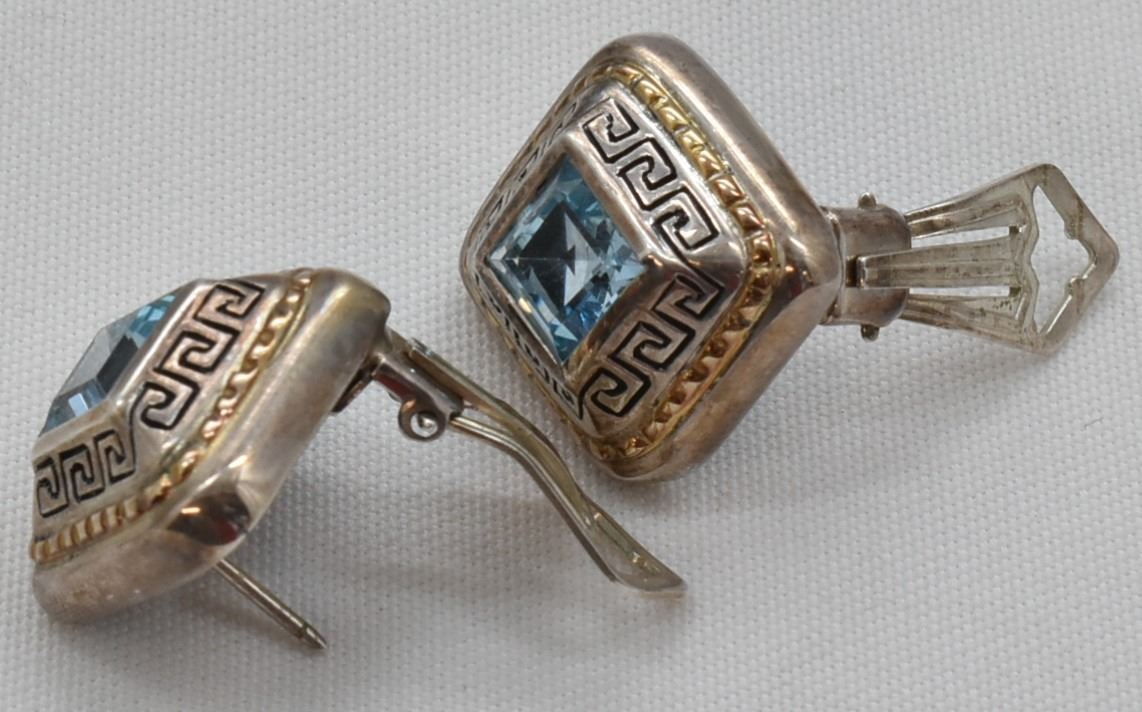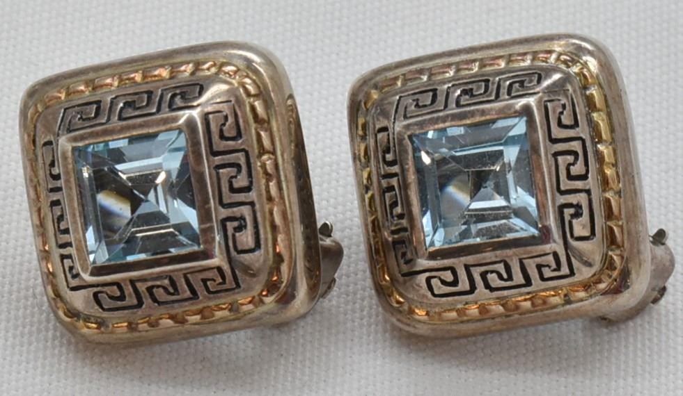 Sunstone Imports Italian 18K Gold, Sterling Silver, and Blue Topaz Earrings, pierced, hallmarked SU and marked .925, Italy, and 18K, measure .75'' square