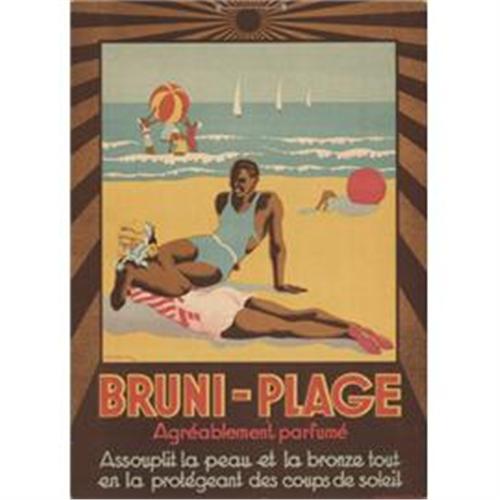 This cartone advertises a tanning lotion that softens & perfumes the skin while protecting it from the sun's rays. Small format beach poster. Ideal for a powder room. Children are playing with a large beach ball in the back ground. Maybe one of the days soon those men's bathing suits will come back into fashion again too! These 'cartone' style posters were used inside buildings near the product and were mounted onto a thin cardboard style backing to protect them.