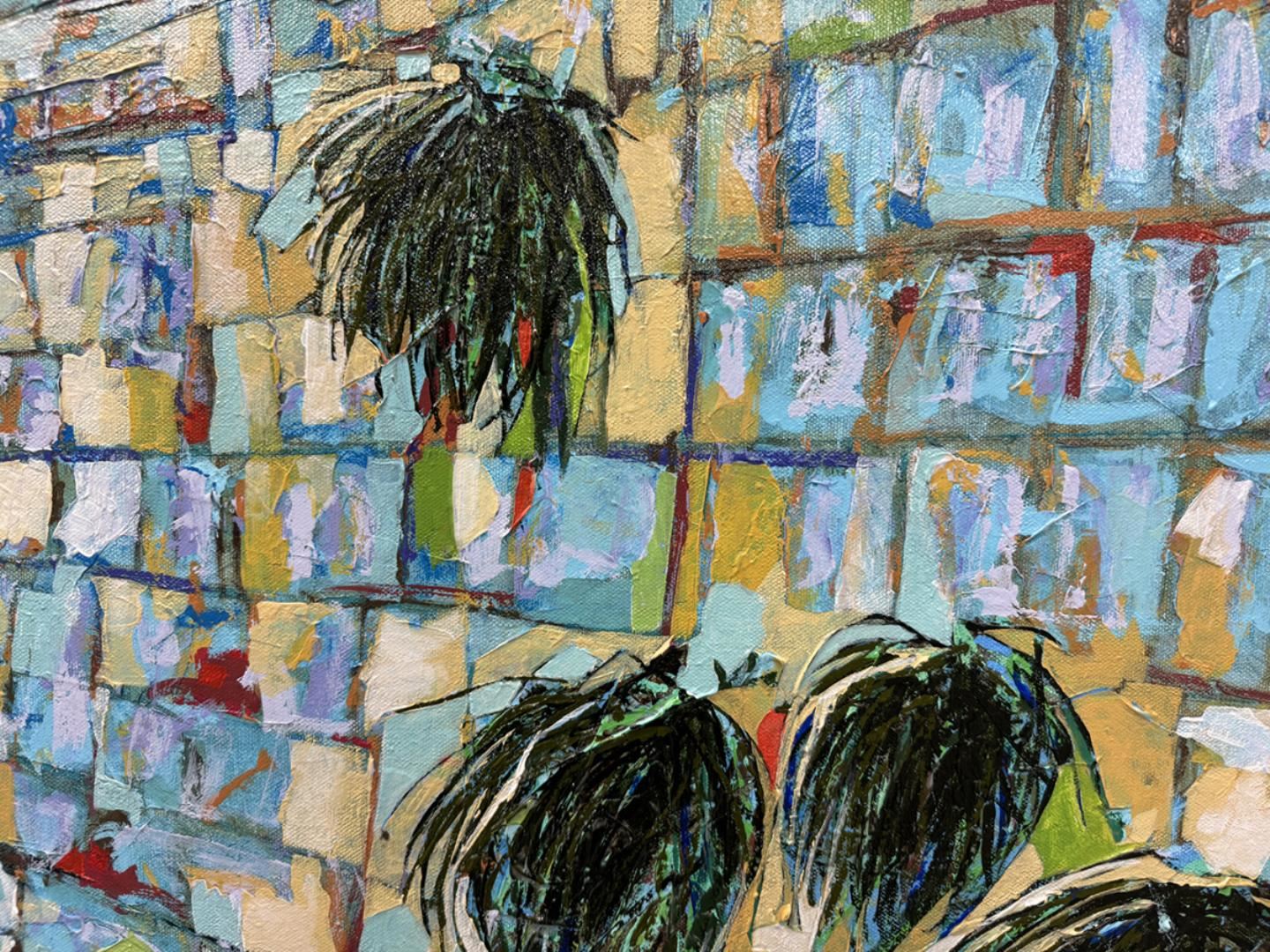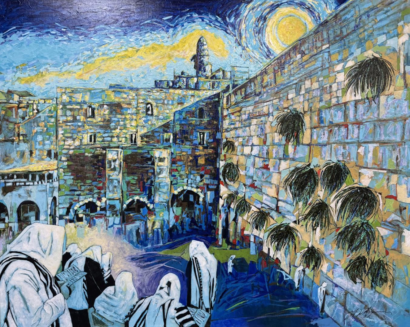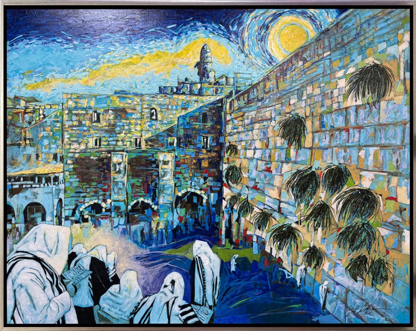 This beautiful acrylic painting on canvas captures the serene essence of dawn's first light as it graces the venerable Western Wall in Jerusalem. This painting comes framed and reay to hang. Art size 62x50" framed size 62x50"
