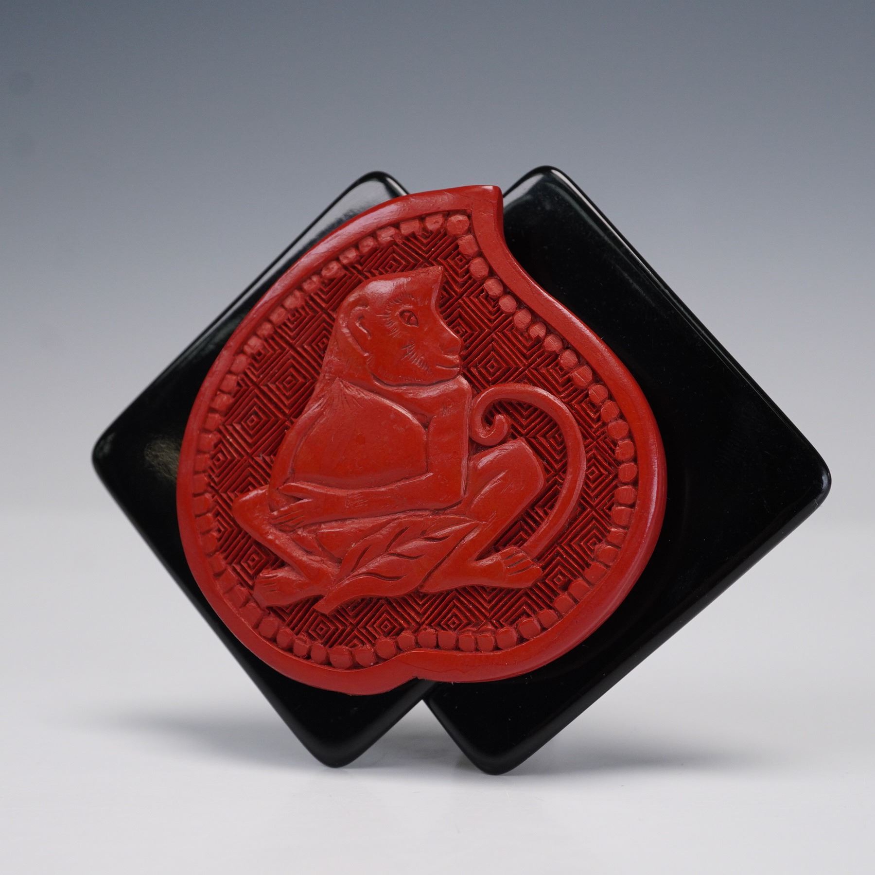 A stunning and bold statement piece, this signed Sunya Currie brooch combines the elegance of Art Deco geometry with the cultural symbolism of traditional cinnabar-style carving. The brooch features two black lacquered squares overlapped in a dynamic tilt, adorned at center with a striking red medallion depicting a contemplative monkey in high relief, seated against a finely textured geometric background. The whimsical design is powerfully graphic and intricately executed, showcasing Currie's signature flair for East-meets-West artistry. A captivating conversation starter and collector’s piece, perfect for lovers of wearable art and animal symbolism.