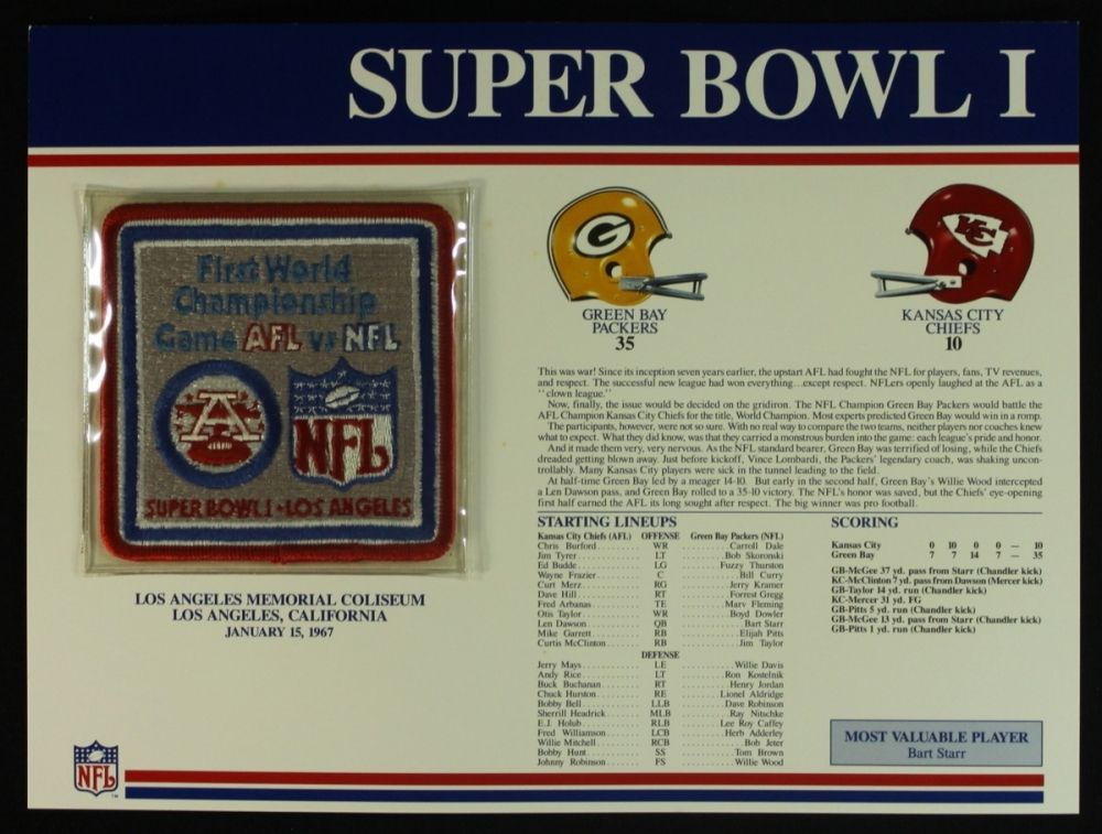 Super Bowl I Patch With 12x9 Scorecard: Packers vs. Chiefs