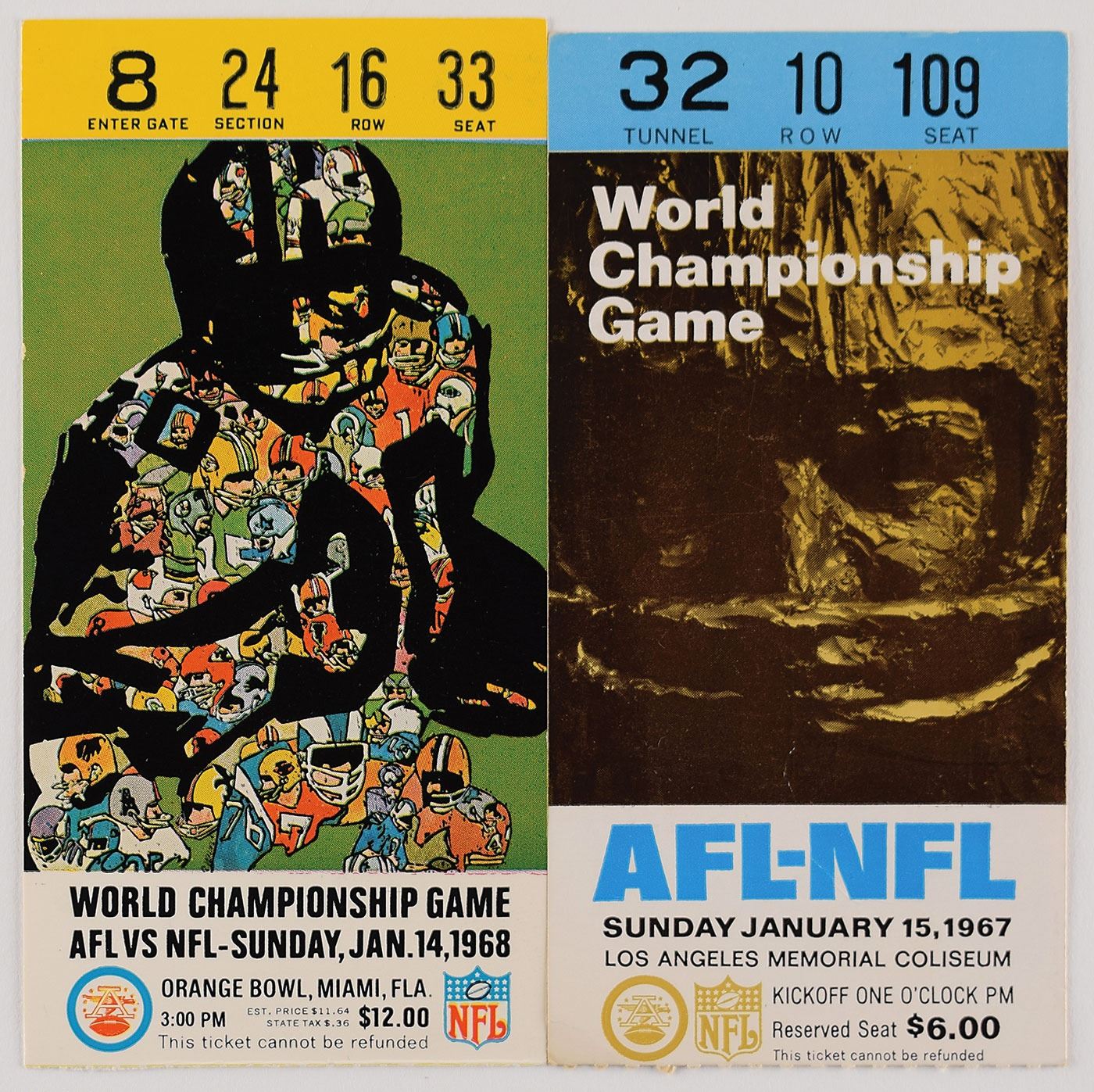 Desirable pair of ticket stubs for the first two AFL-NFL World Championship Games, known retroactively as Super Bowls I and II, both 2.5 x 5.25. The ticket stub for Super Bowl I, which was held at the Los Angeles Memorial Coliseum on January 15, 1967, is for Tunnel 32, Row 10, and Seat 109; and the ticket stub for Super Bowl II, which was held at the Miami Orange Bowl on January 14, 1968, is for Gate 8, Section 24, Row 16, and Seat 33. In overall fine condition.