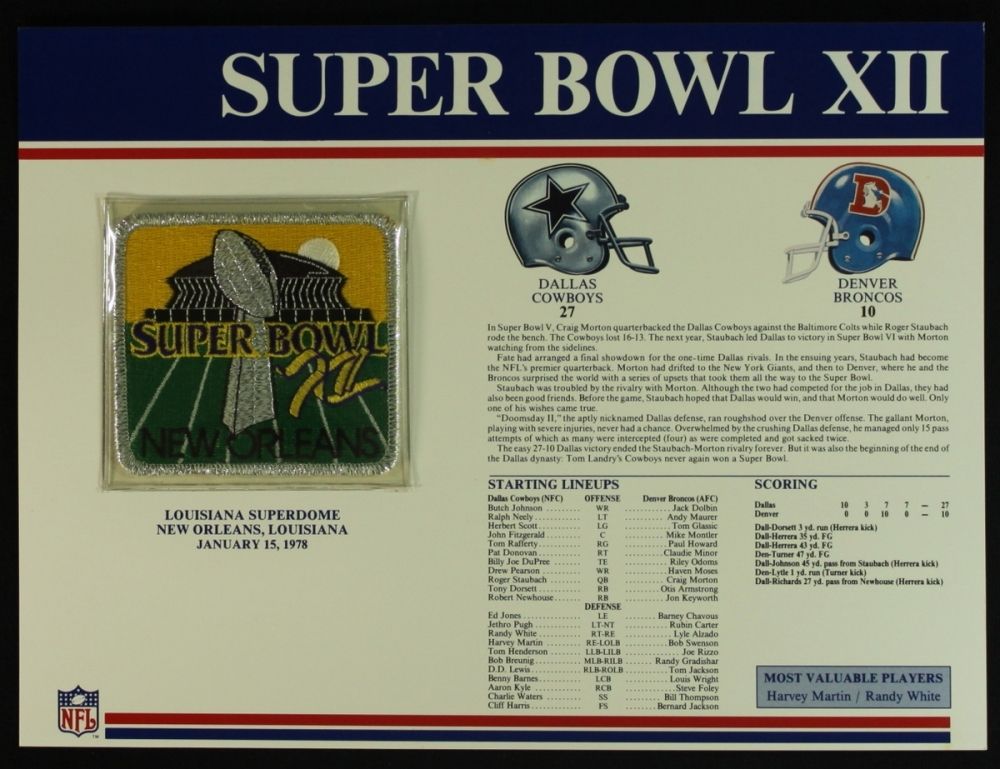 Super Bowl XII Patch With 12x9 Scorecard: Cowboys vs. Broncos