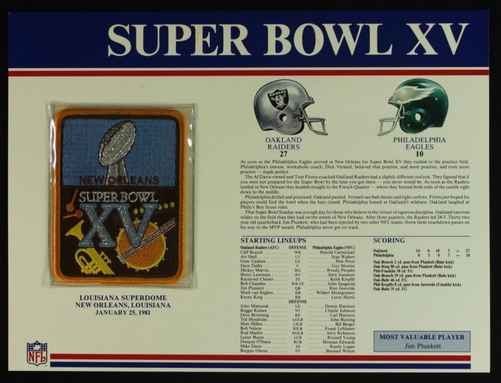 Super Bowl XV Patch With 12x9 Scorecard: Raiders vs. Eagles