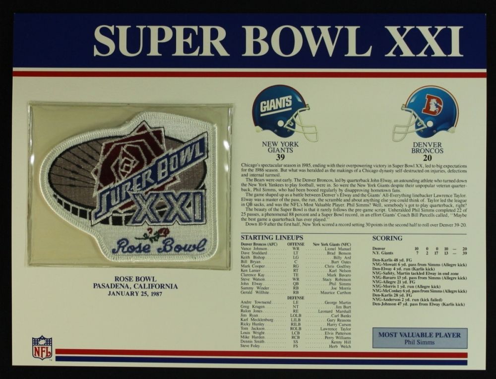 Super Bowl XXI Patch With 12x9 Scorecard: Giants vs. Broncos