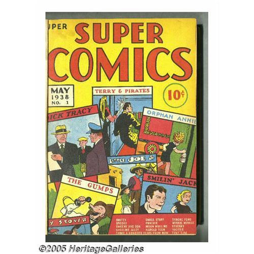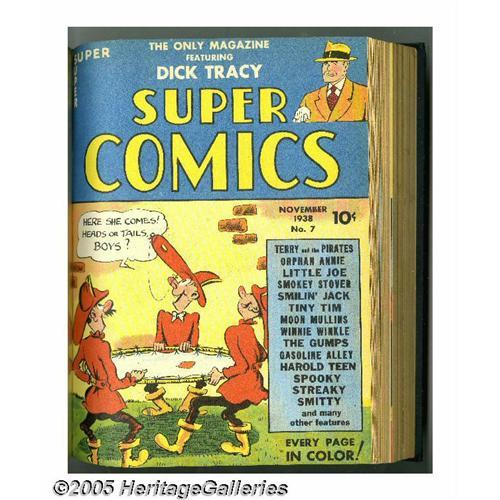 <B>Super Comics #1-12 File Copies Bound Volume (Dell, 1938-39).</B></I> One of Western Publishing's first comic book titles was " "<B>Super Comics</B></I>. This title even pre-dates the ""Dell"" company logo, and features reprinted newspaper strips such as <I>Dick Tracy</B></I>, <I>Terry and the Pirates</B></I>, <I>The Gumps</B></I>, <I>Little Orphan Annie</B></I>, <I>Gasoline Alley</B></I>, <I>Smilin' Jack</B></I>, <I>Moon Mullins</B></I>, and more. This is one of the oldest bound volumes to come out of the Random House Archives; like others from that collection, it consists of file copies that were bound and trimmed into a hardback volume, designed for office reference use. This book has a few rough spots on the binding: there's a chunk missing from the spine of the book, and the back hinge is showing signs of beginning to come loose. But the comics inside still look pretty fresh, with colorful, matt-finish covers and supple pages. On the inside front cover is written ""Property of Robert S. Callender"", the former manager of Western Printing. A very historic volume! Overstreet 2005 VG 4.0 value for group = $2,074. <I>From the Random House Archives.</B></I> <BR><BR><B>Important notice:</B> Heritage usually auctions material at the rate of 200-250 lots per hour. On some occasions eBay Live bid software or the Internet may not be able to keep up with the pace of the auction. We recommend placing a realistic absentee bid now as insurance to avoid disappointment. Occasionally the auctioneer may eliminate or reject an eBay Live bid, and the auctioneer may also reopen a lot after the close of the eBay live bidding (usually because we missed an audience bid), and may reject your bid even if it shows you as the winning bidder. By bidding via eBay Live, you agree that Heritage may award the lot to another bidder at its sole discretion under the circumstances described above or any other reasonable circumstances. Since eBay bids are not shown to us until we open the lot on