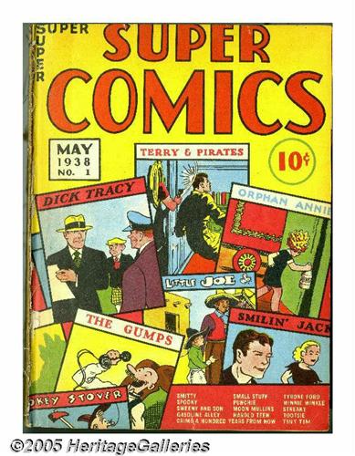 <B>Super Comics #1-48 Bound Volumes (Dell, 1938-42).</B></I> There's a whole lot of comic history wrapped up within these four bound volumes. <B>Super Comics</B></I> was one of Dell's earliest series, specializing in reprinted newspaper strips like <I>Dick Tracy</B></I>, <I>Smokey Stover</B></I>, <I>Little Orphan Annie</B></I>, and others. In time, original features like "Magic Morro" were added. Each volume contains twelve 64-page issues, making each book quite a hefty tome. All comics were Western Publishing file copies that were bound and trimmed for office use. Due to the advanced age of these books, a few problems need to be noted: Vol. 1 has had the entire block of comics separate from the binding, which has split in two, leaving the back cover loose. The back cover of issue #12 was neatly pulled loose from the rest of the comic, and is joined to this back piece; also, a wear spot has developed on the spine cover. Vol. 2 is fully intact, but beginning to split along the seams, and the cover shows some wear. Volumes three and four are a little ragged at the top spine area, but not bad. All comics are in nice condition, with no major problems. Approximate Overstreet value for group = $1000.