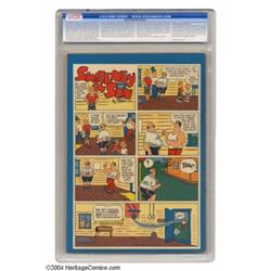 <B>Super Comics #85 File Copy (Dell, 1945) CGC VF/NM 9.0 Off-white pages.</B></I> Dick Tracy was the lead feature in <B>Super Comics</B></I> at the time, but Smitty and Herby take center stage on this issue's cover. Tiny Tim, Harold Teen, and Winnie Winkle are also featured inside. There is currently only one copy of this issue that has been graded higher by CGC. Overstreet 2004 VF/NM 9.0 value = $99; NM- 9.2 value = $125. <BR><BR><B>Important notice:</B> Heritage usually auctions material at the rate of 200-250 lots per hour. On some occasions eBay Live bid software or the Internet may not be able to keep up with the pace of the auction. We recommend placing a realistic absentee bid now as insurance to avoid disappointment. Occasionally the auctioneer may eliminate or reject an eBay Live bid, and the auctioneer may also reopen a lot after the close of the eBay live bidding (usually because we missed an audience bid), and may reject your bid even if it shows you as the winning bidder. By bidding via eBay Live, you agree that Heritage may award the lot to another bidder at its sole discretion under the circumstances described above or any other reasonable circumstances. Since eBay bids are not shown to us until we open the lot on the floor, we treat those bids just like floor bids. In most cases the floor responds before the eBay bid is presented to us, due to Internet lag time, so for consistency we have made it a policy that floor bids are always considered first over tie eBay live bids. Also please note that all Heritage lots purchased through eBay Live carry a 20% Buyer's Premium. Please make sure you read the Terms and Conditions before you bid.
